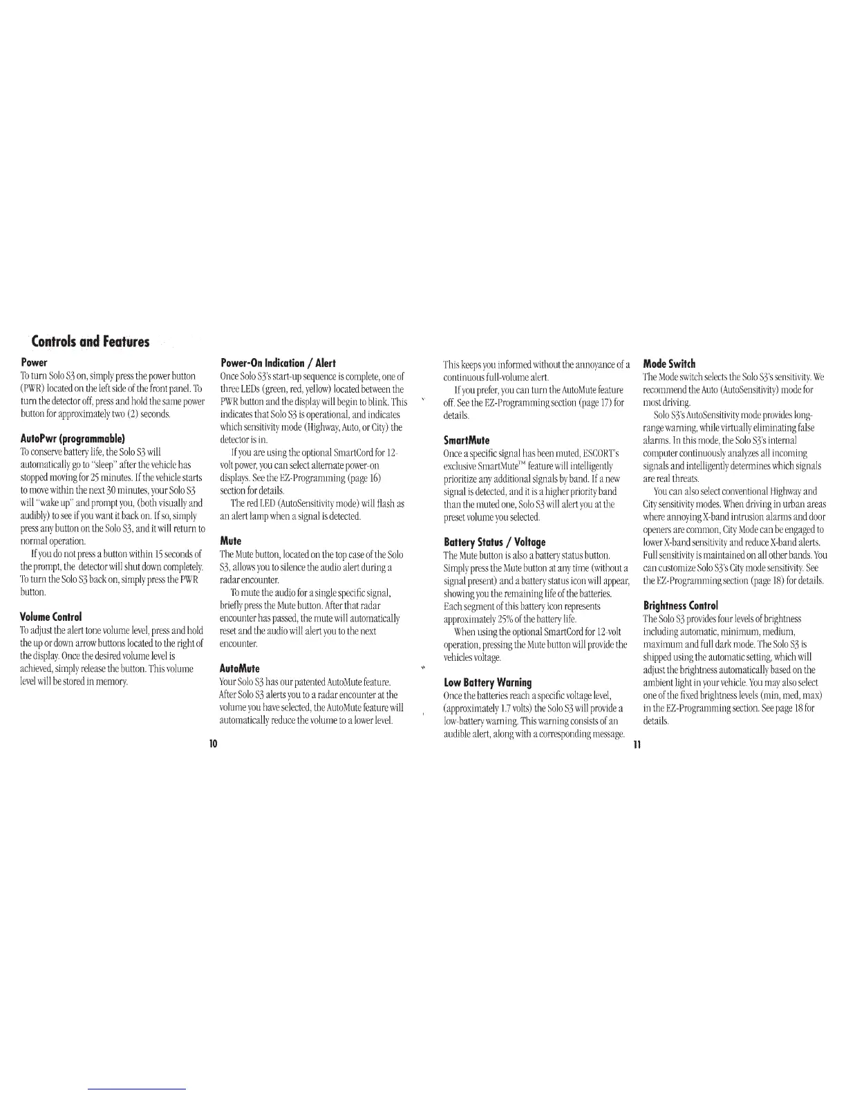 Escort Solo S3 - Solo S3 Controls and Features Explained; Power, Volume, and AutoMute Controls; Mode Switch and Brightness Control