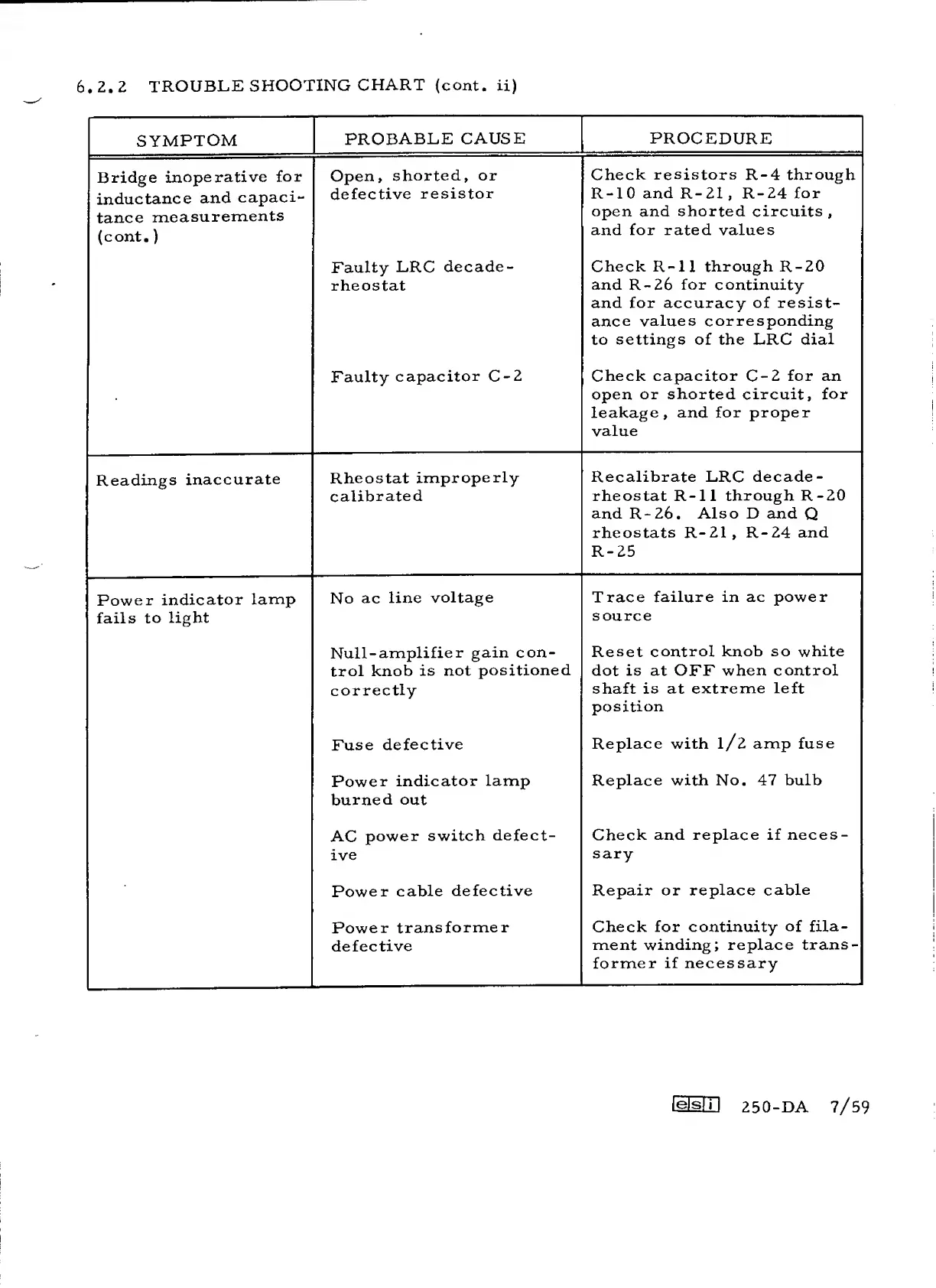 ESI 250-DA - Troubleshooting Chart for Inaccurate Readings and Power Issues