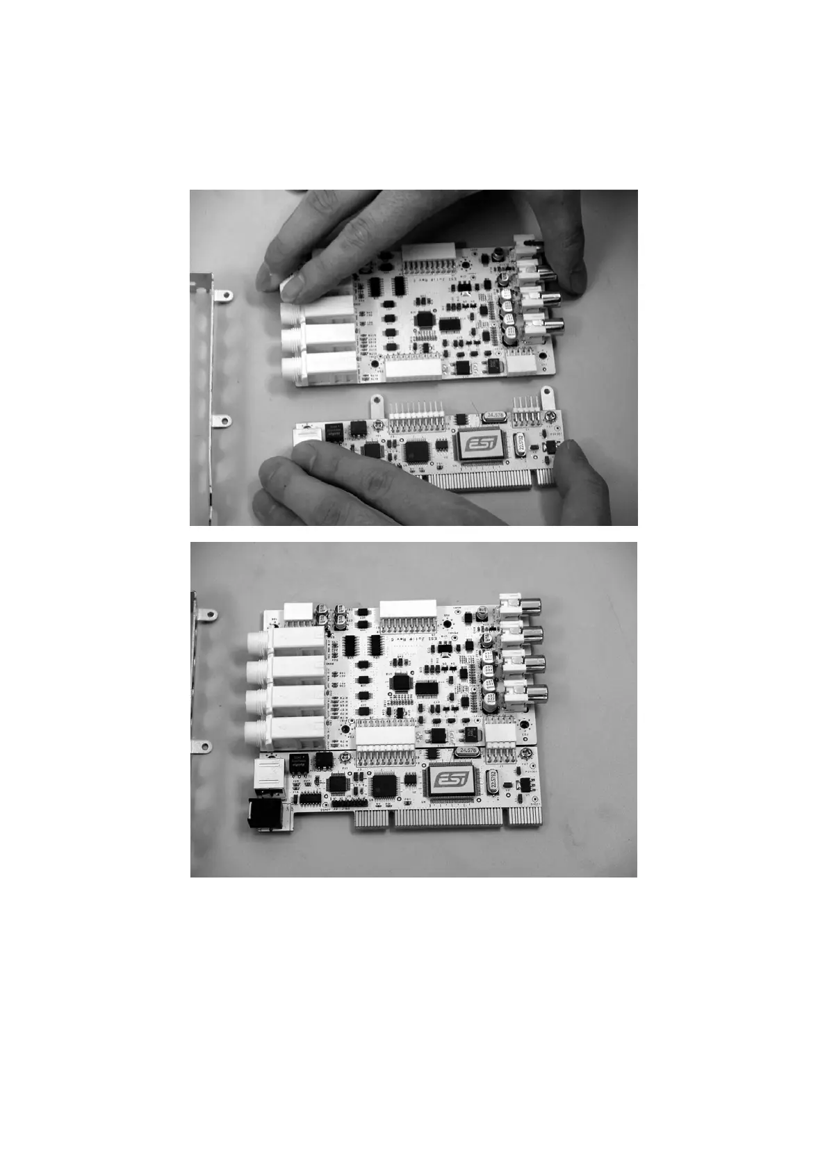 Hold the edges of the card and carefully combine PCI card like shown on the pictures below.