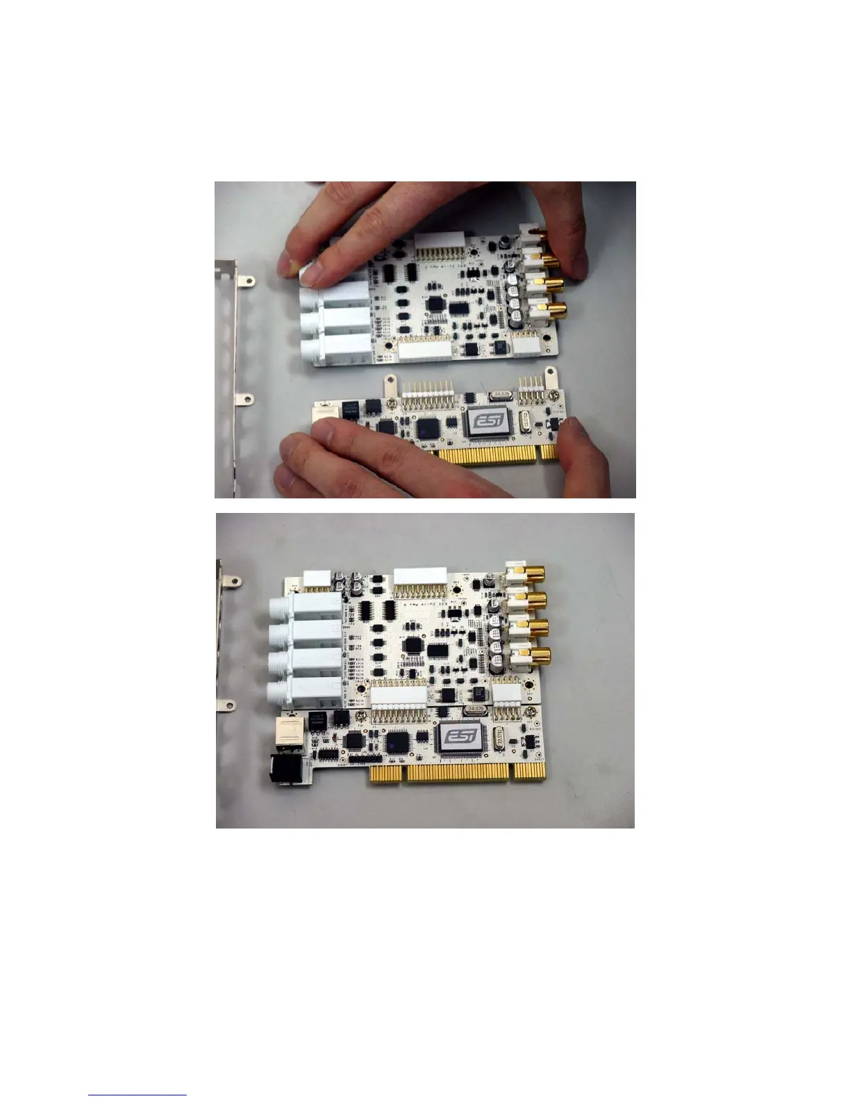 Hold the edges of the card and carefully combine PCI card like shown on the pictures below.