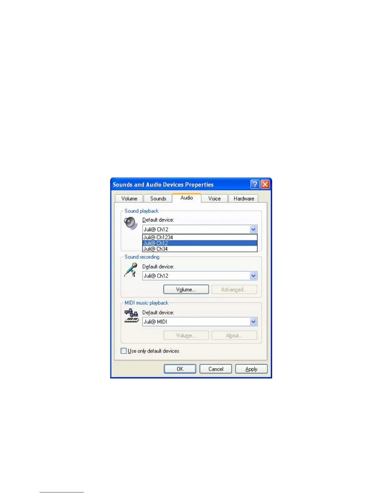 Go to ‘My computer-> Console -> Sounds and Audio Device Properties -> Audio’. Select the Juli@