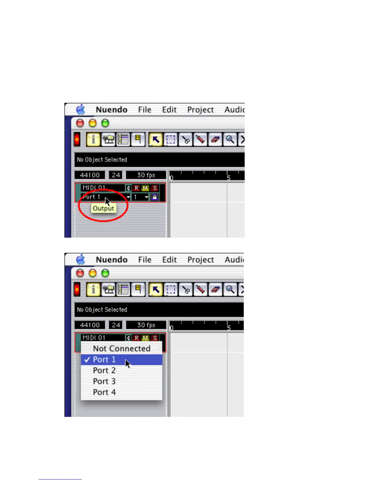 In Nuendo, you can choose a port for a MIDI track in the Track List area.