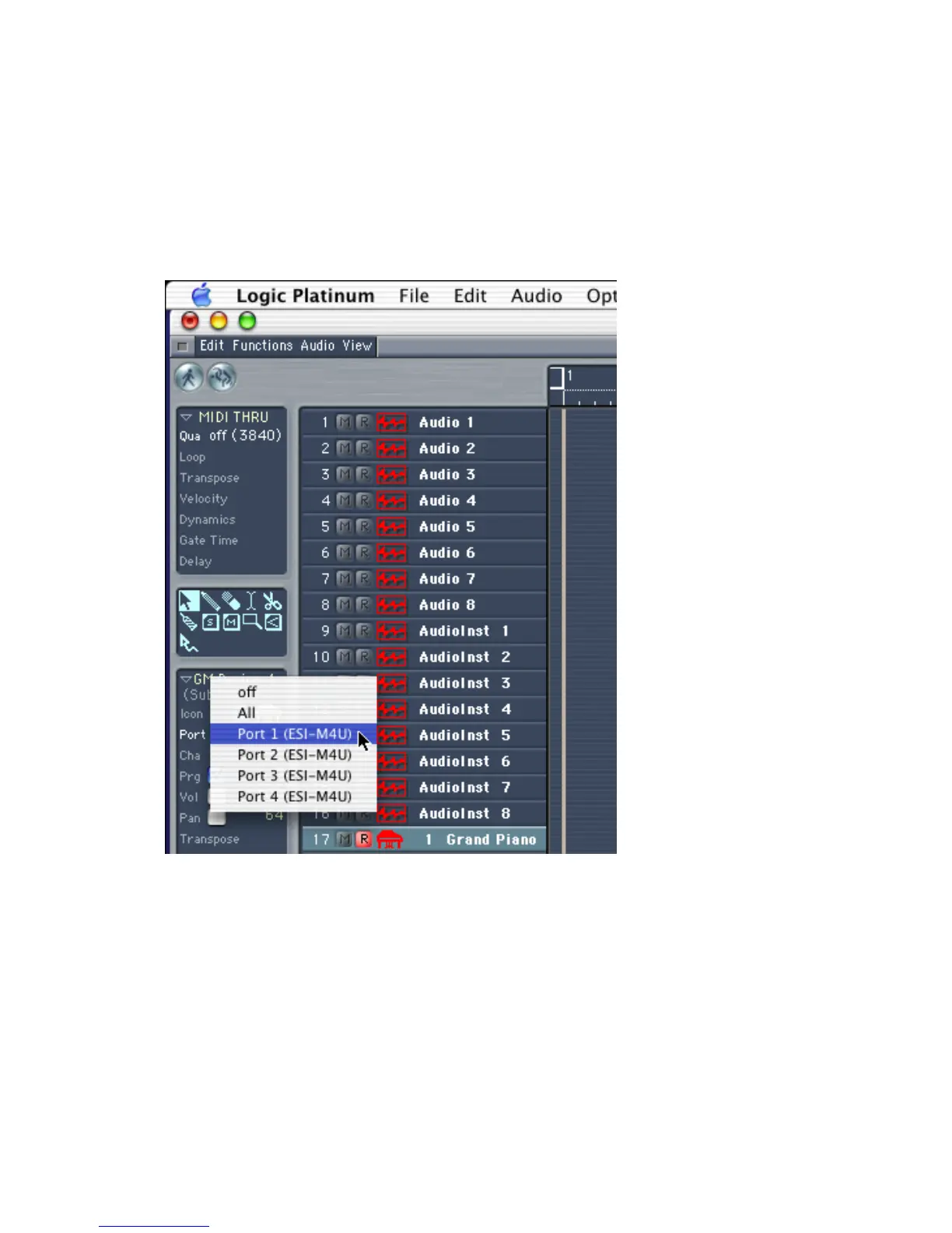 In Logic, you can choose a port for a MIDI track in the instrument parameter box in