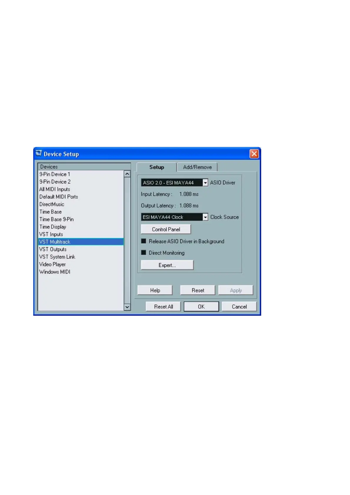 After launching Cubase SX, go to Device -> Device Setup -> VST Multitrack. Select ‘ASIO 2.0 – ESI