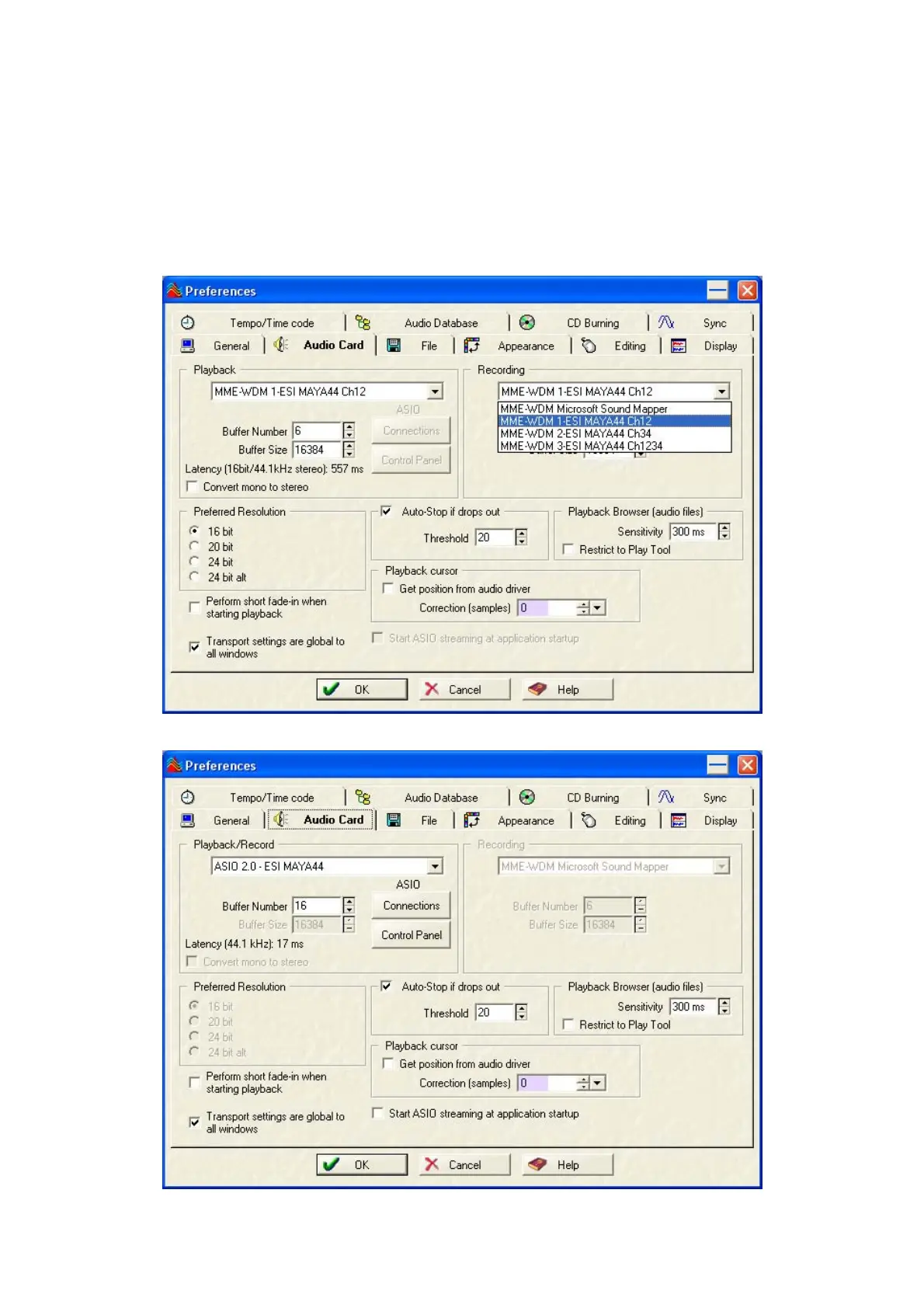 After launching Wave Lab, go to Options -> Preference -> Audio Card. Select either ‘MME-WDM 1-ESI