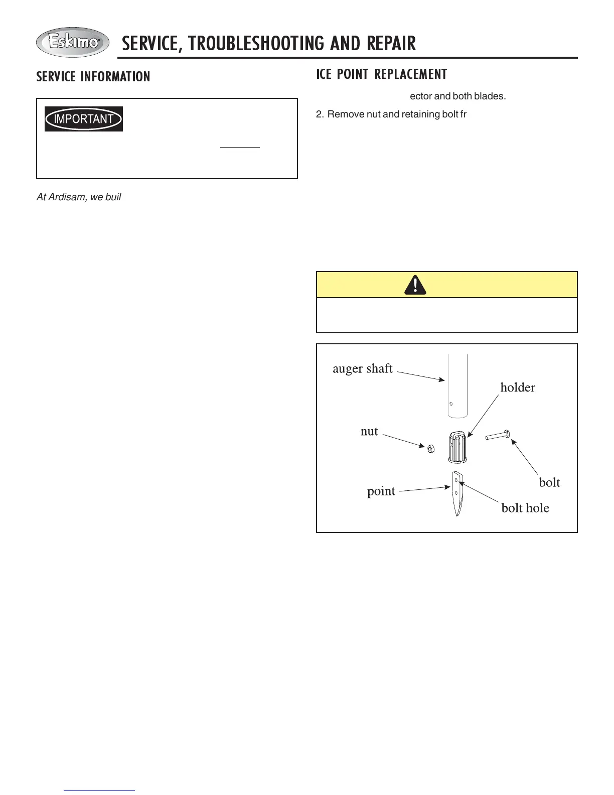 bolt hole in point with holes in auger shaft. DO NOT