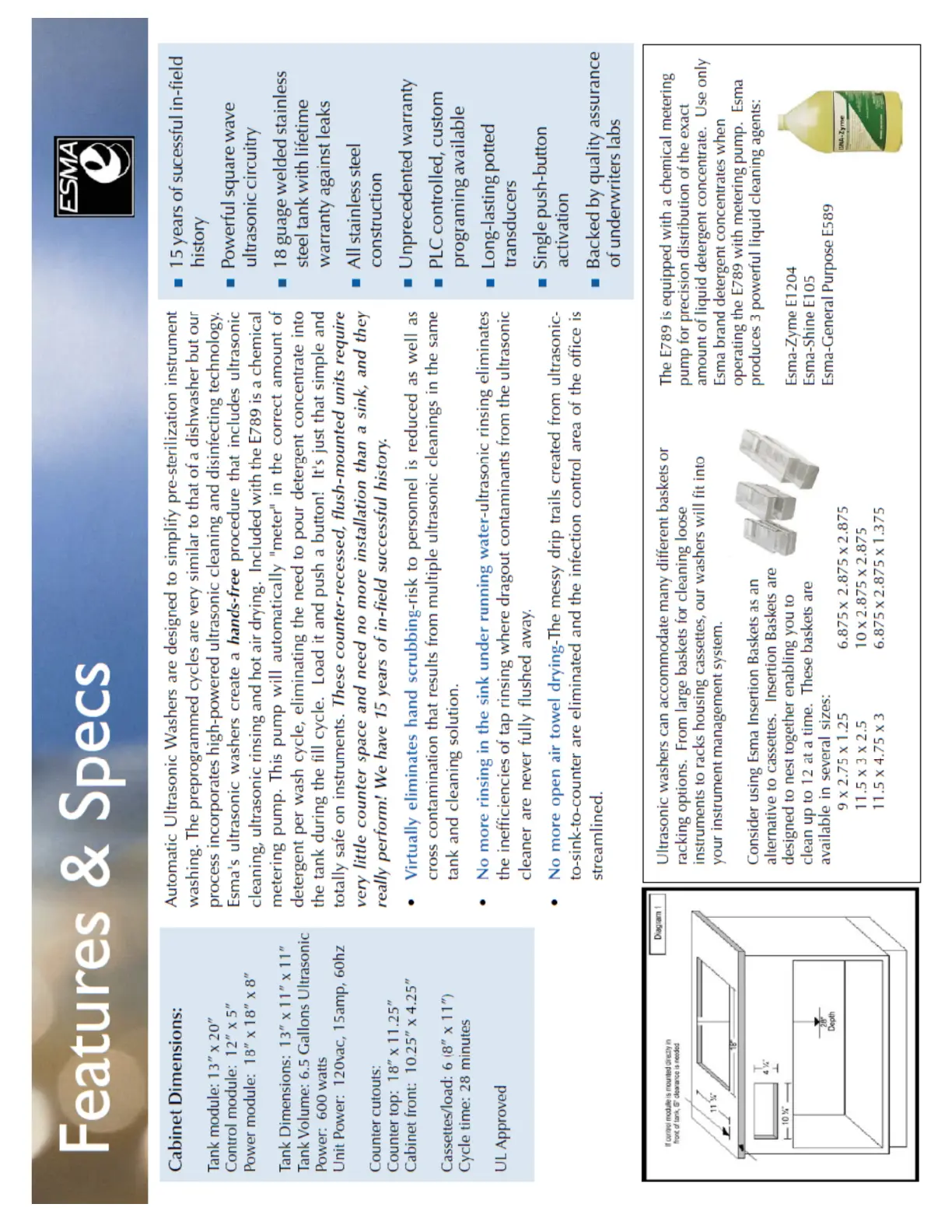 Esma E789 - Features and Specifications; Cabinet Dimensions; Tank Dimensions and Power; Counter Cutout Specifications