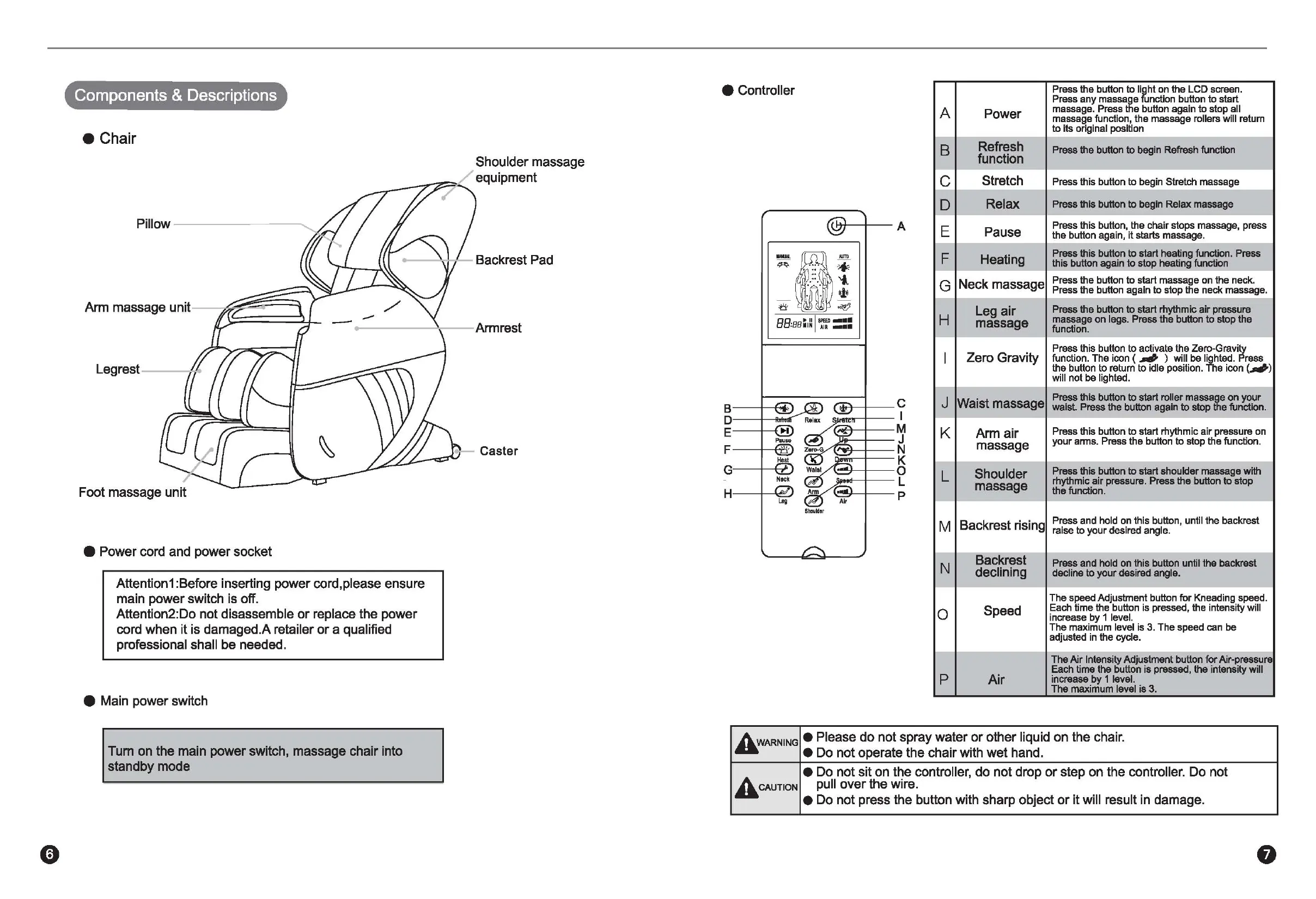 Tum on the main power switch, massage chair into