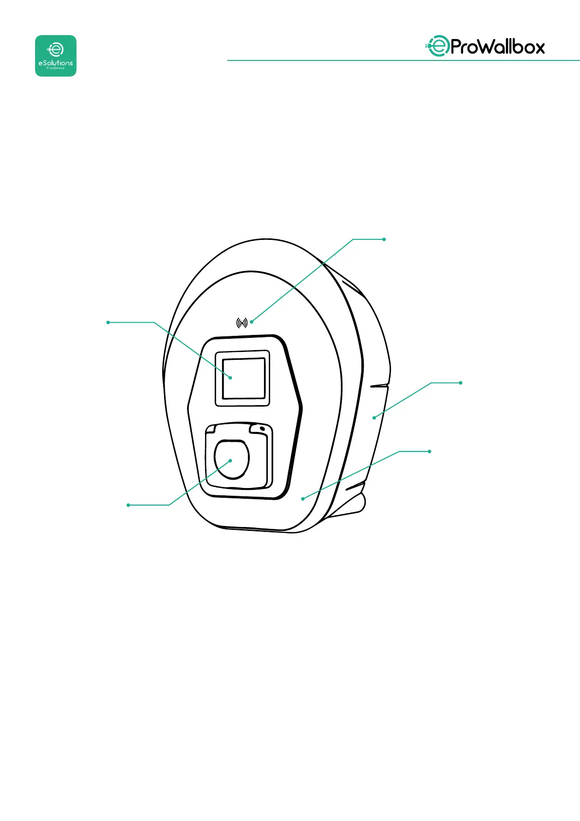 Toliau paveikslėlyje pavaizduota eProWallbox ir pagrindinės jos dalys.