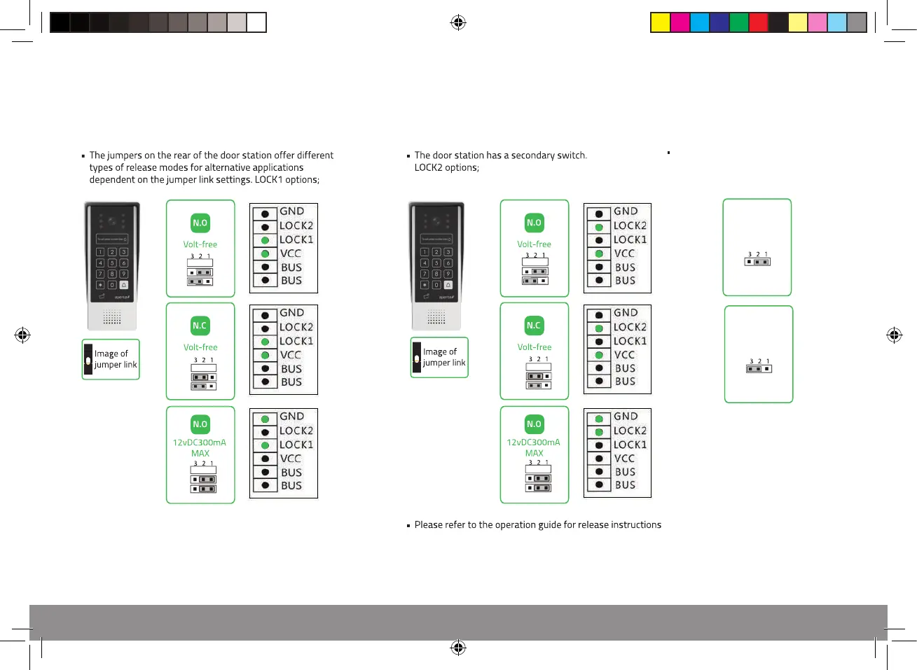 ESP Aperta APDSPXMW - Lock Connection Example 2; Jumper Settings for Lock Release Modes; Operation Mode Switching (Multi-Way;Single-Way)