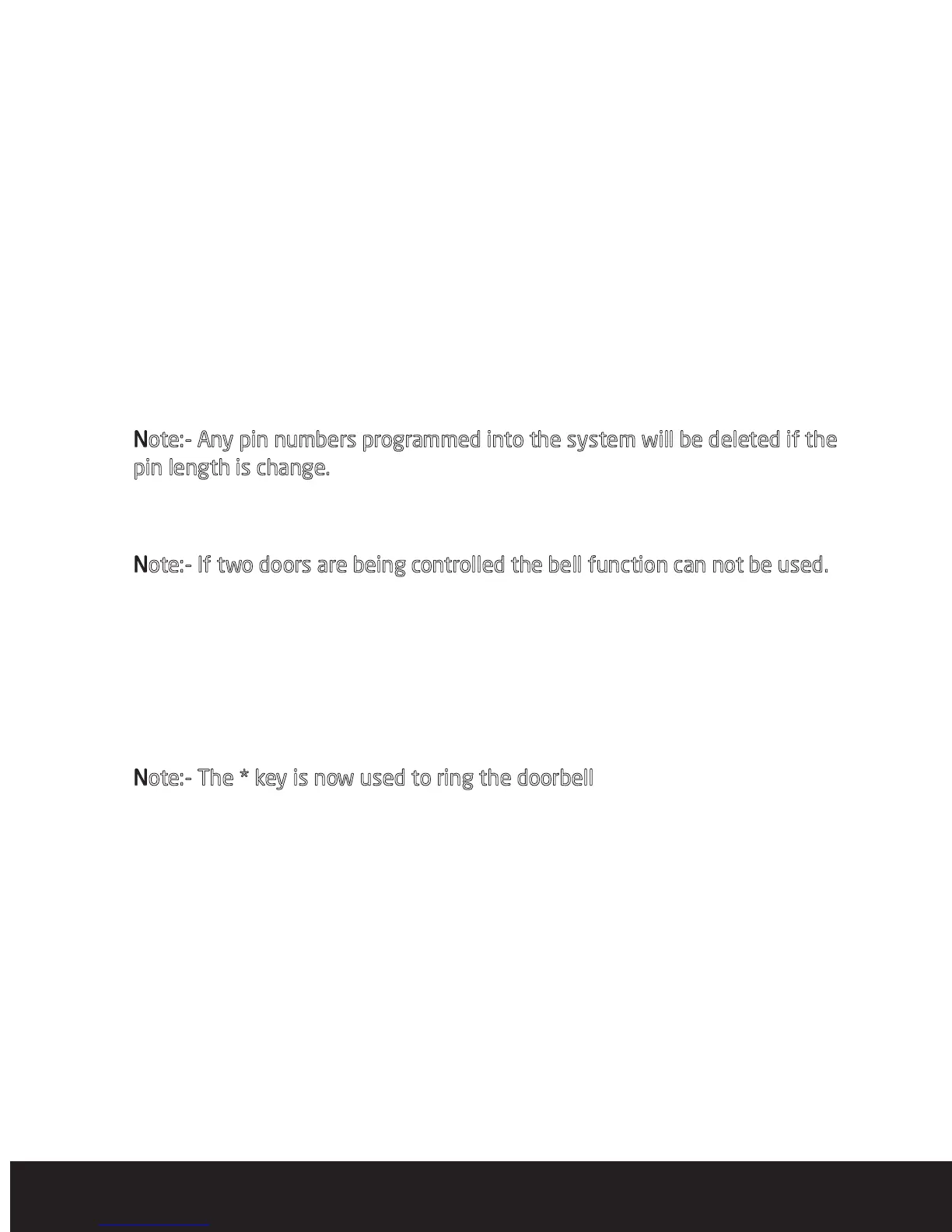 Note:- Any pin numbers programmed into the system will be deleted if the