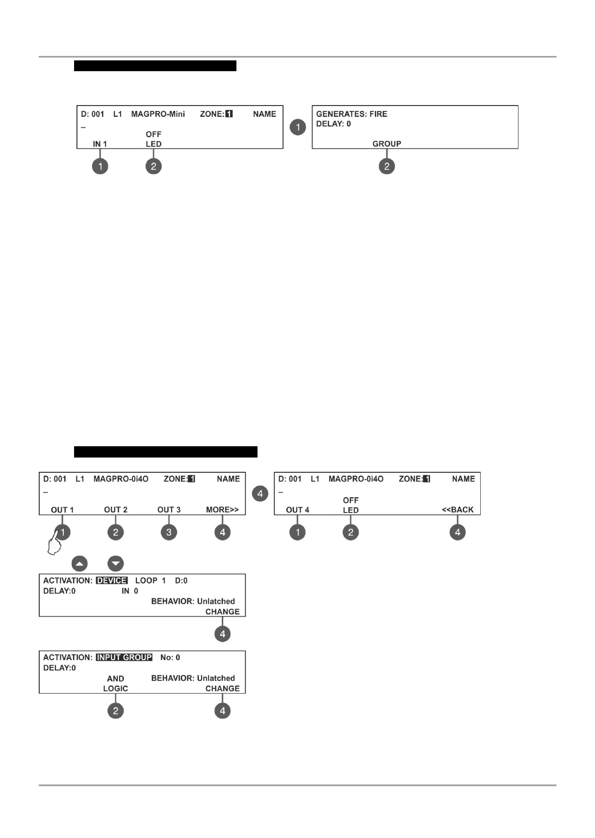 GENERATES – Use the up/ down arrow buttons to select generated event at the input: FIRE/ EVACUATE/