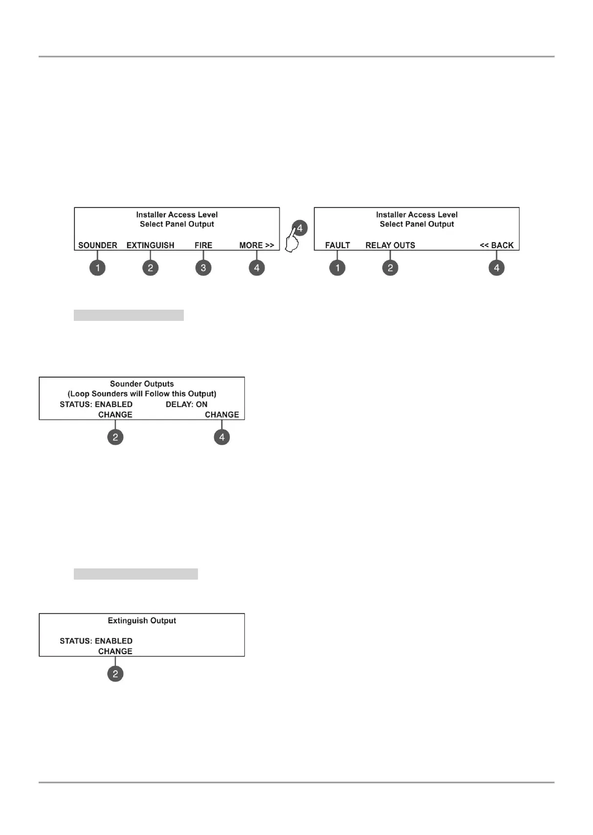 In this submenu the installer can disable/ enable the extinguish output activation. To access the EXTINGUISH