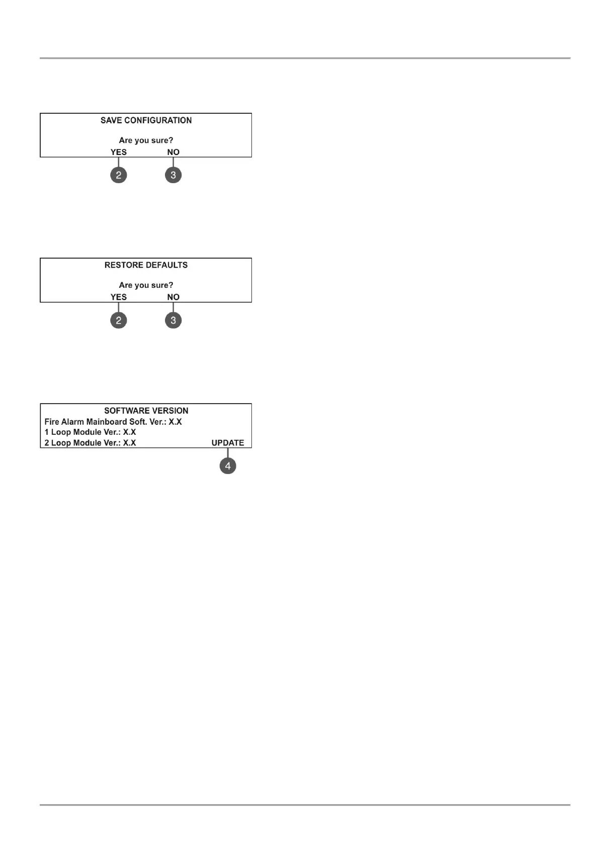 In this menu the installer can review the software versions of the main board and used loop modules and also has