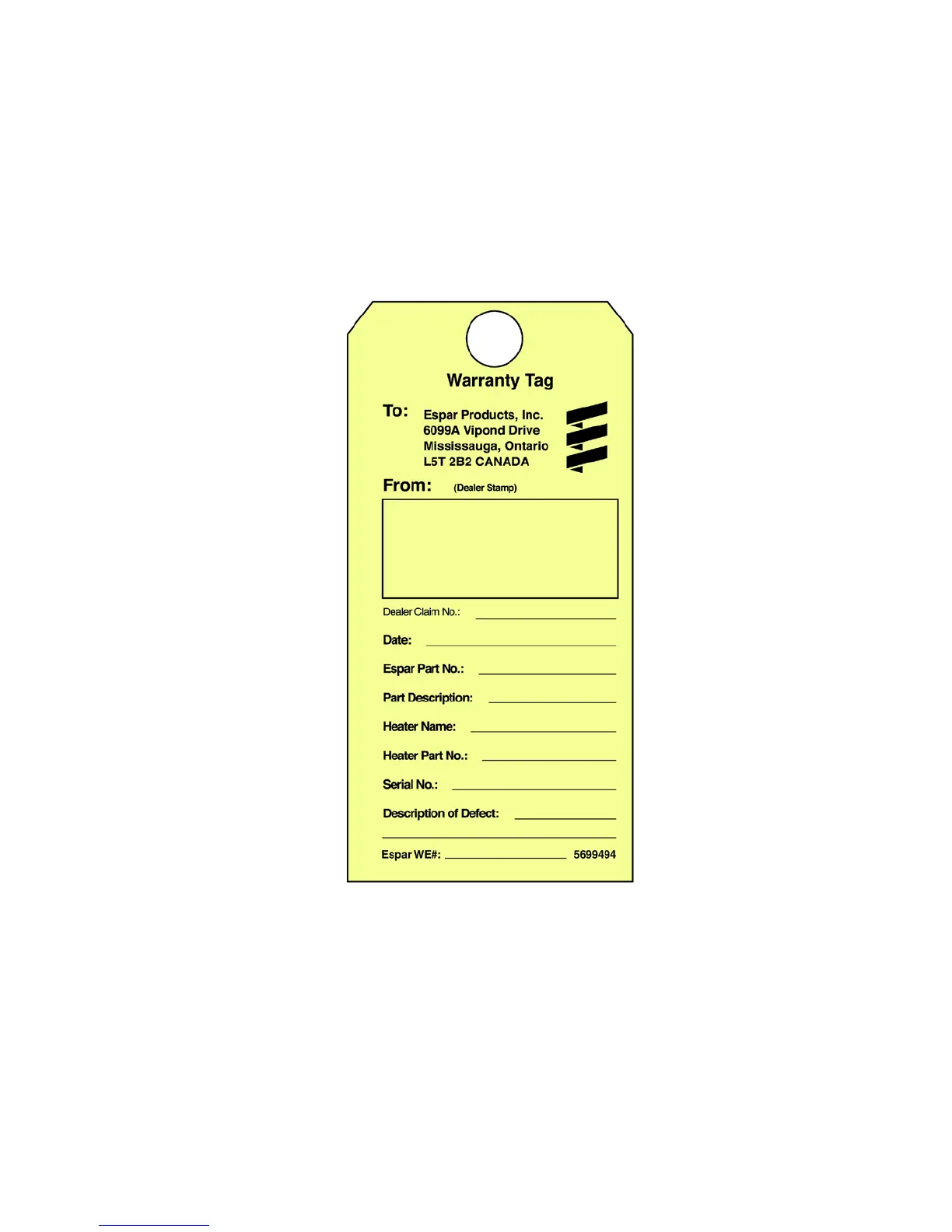 Espar Hydronic - Sample of Warranty Tag