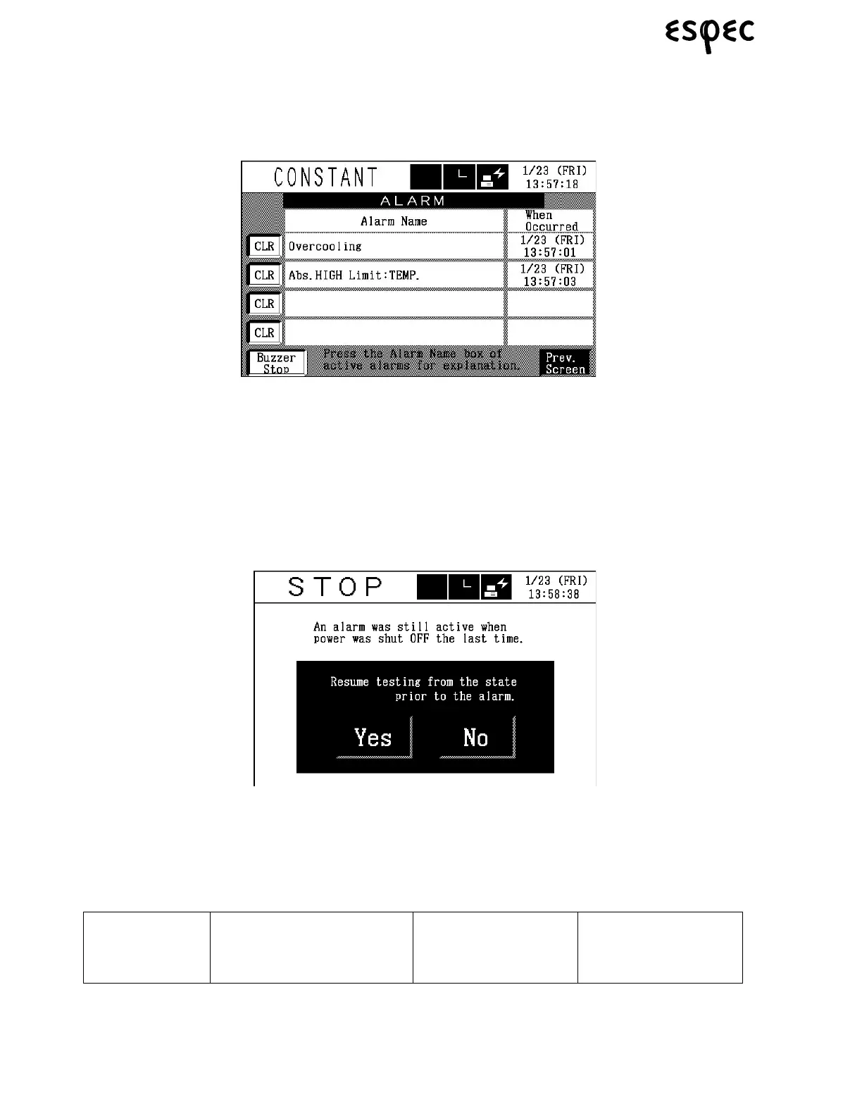 YES button: Resumes testing from the state prior to the alarm