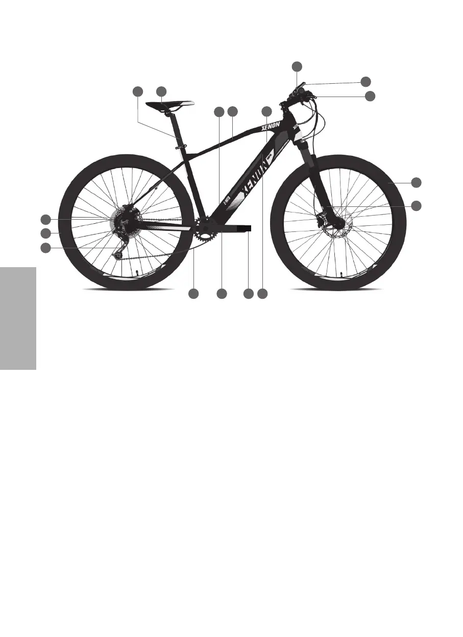 - 14 PEDALES - 15 MANIVELLE - 16 CHAINE - 17 ÉCRAN