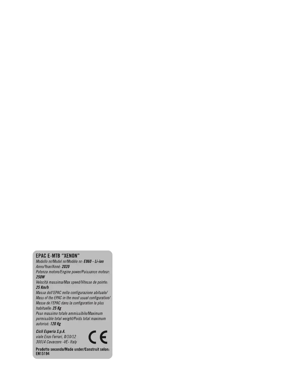 La bicicletta è dotata di una targhetta di identicazione su cui sono riportati gli estremi