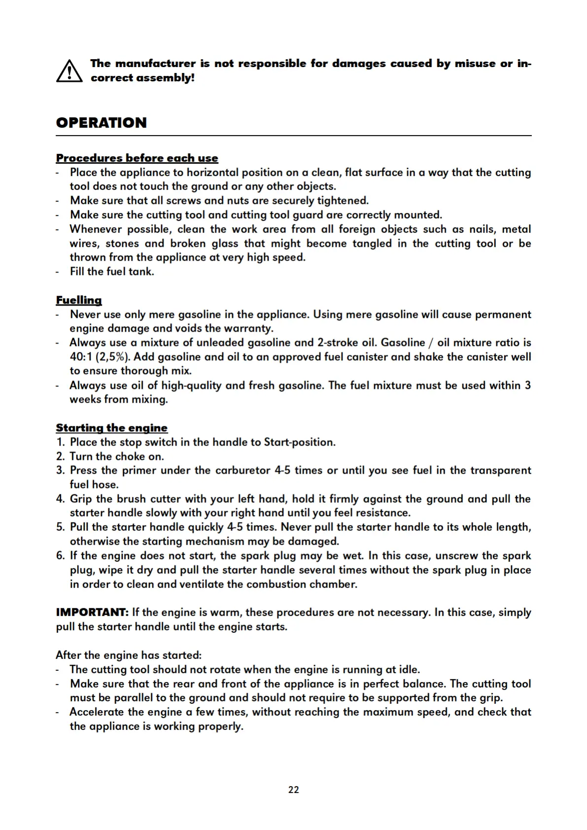 Espina XTP103 - Operation; Procedures before each use; Fuelling; Starting the engine