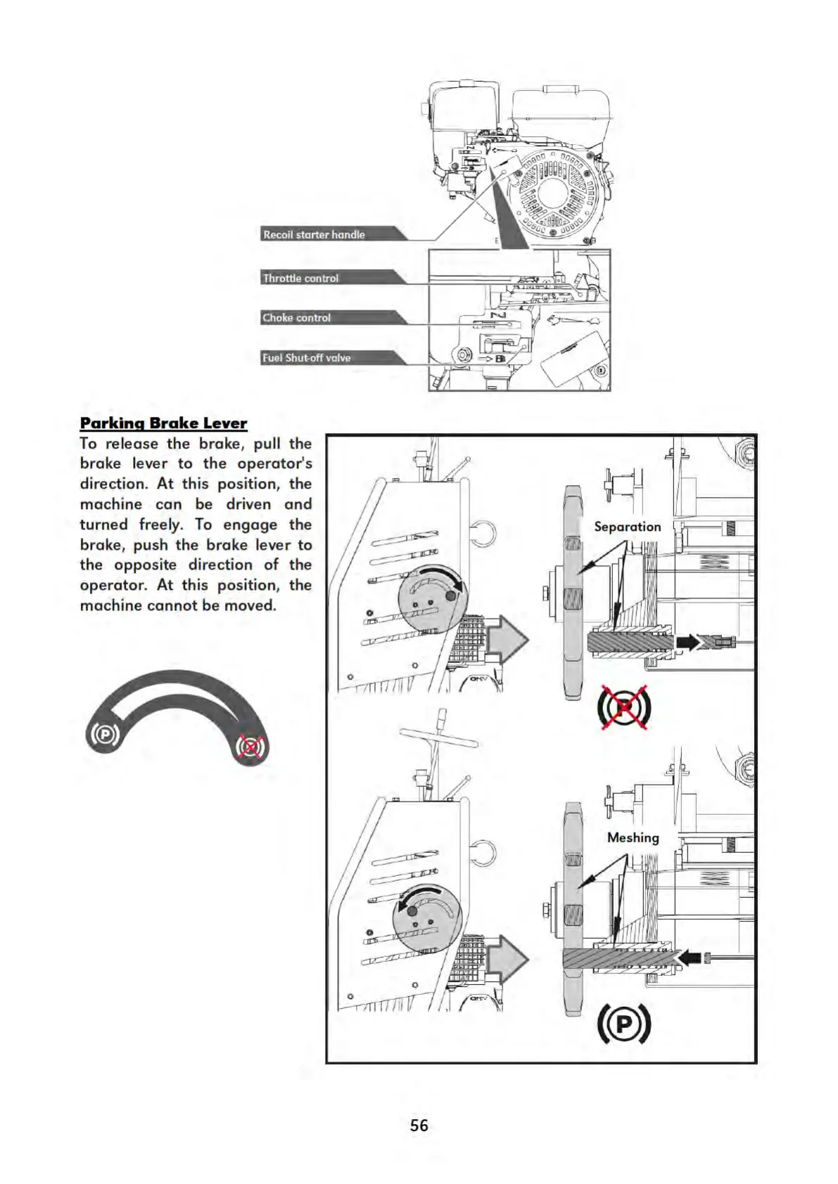 Espina XTP131 - Recoil starter handle; Fuel Shut-Off Valve; Parking Brake Lever Operation