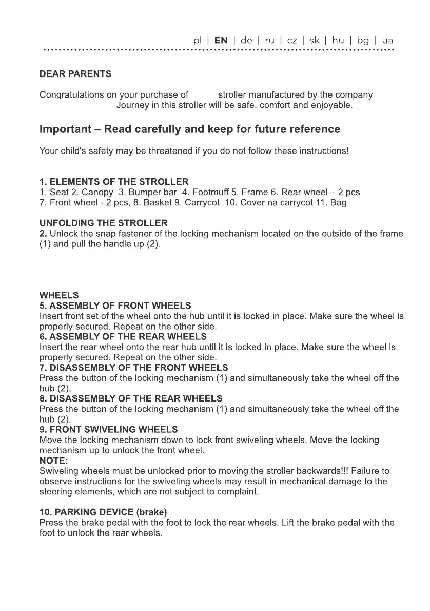 espiro YOGA - Stroller Setup and Basic Functions; Unfolding the Stroller; Wheel Installation and Parking Brake Operation