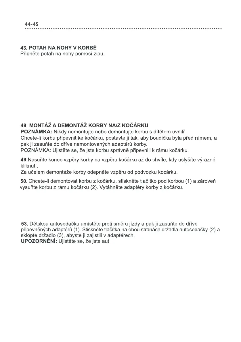 54. Chcete-li připevnit korbu na kočárek, umístěte ji tak, aby boudička byla v přední části