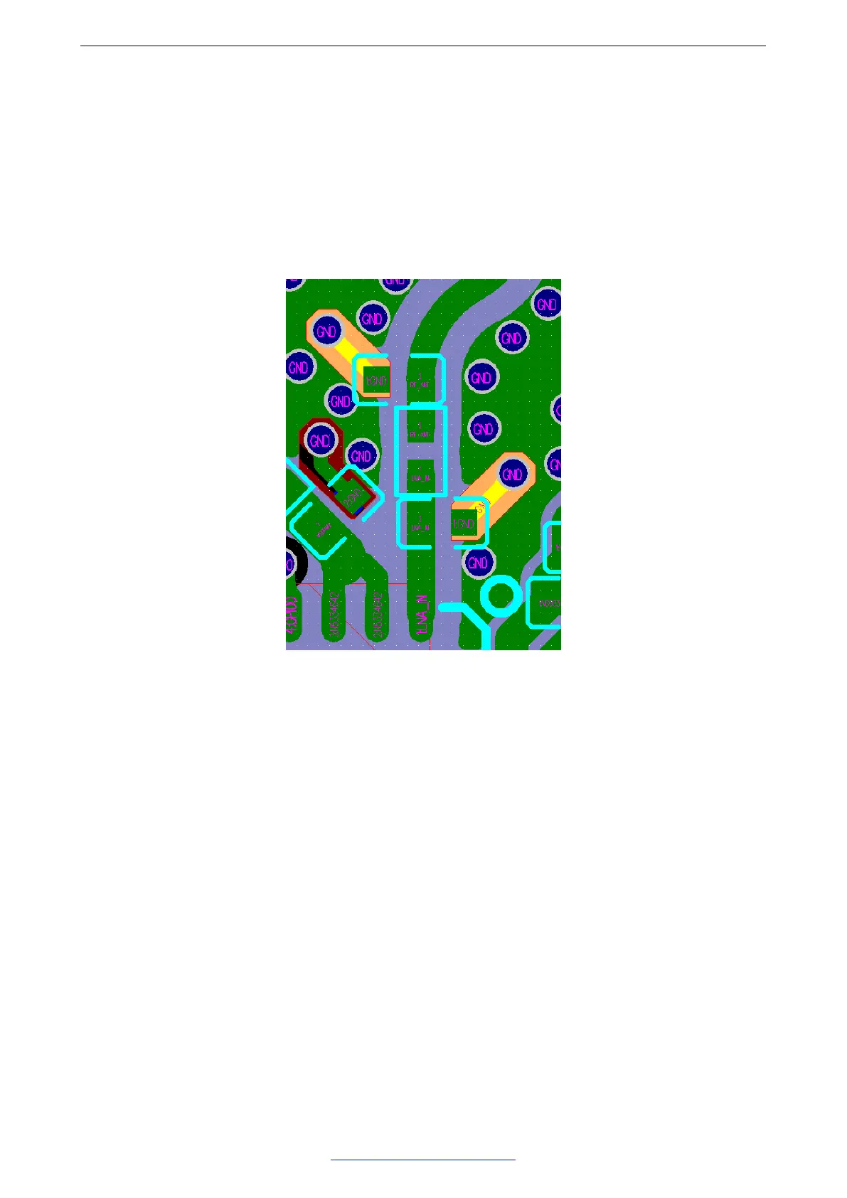 • The RF trace should be routed on the outer layer without vias, i.e., should not cross layers. The RF trace