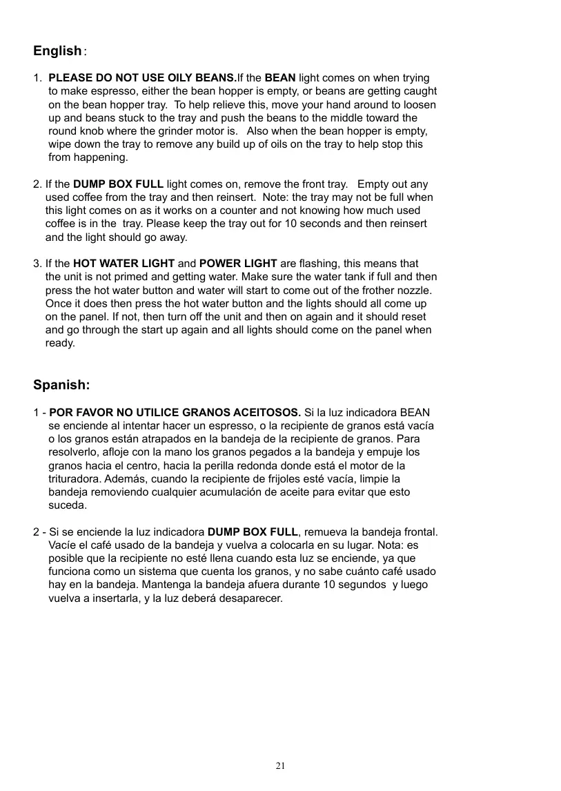 1. PLEASE DO NOT USE OILY BEANS.If the BEAN light comes on when trying