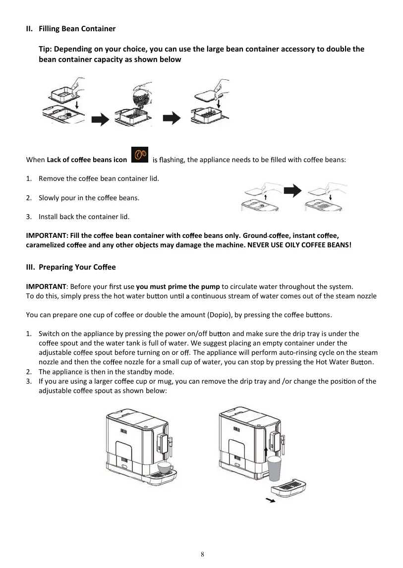 caramelized co ee and any other objects may damage the machine. NEVER USE OILY COFFEE BEANS!