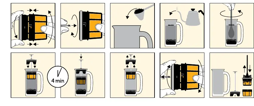 [5] Stir. [6] Cover with filters and lid. Leave the plunger raised. Wait 4 minutes.