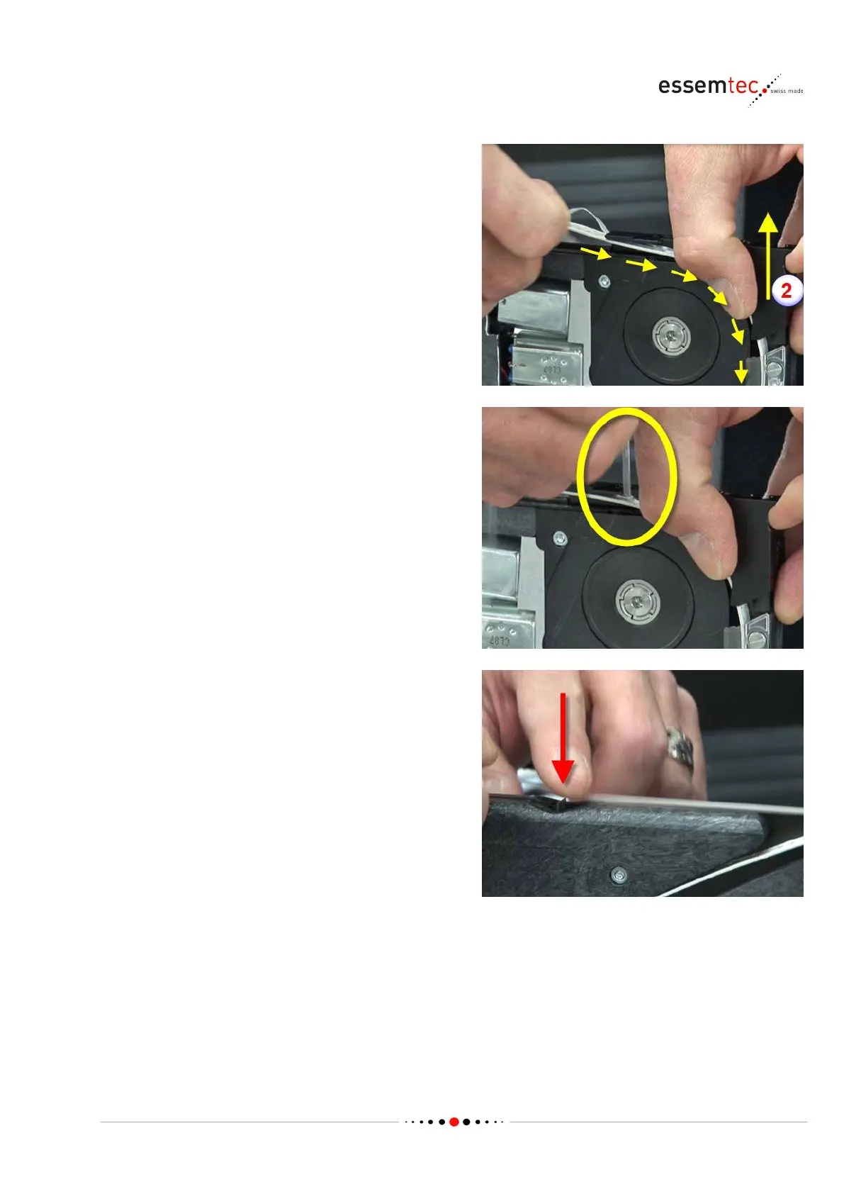 Lift the downholder (2) and thread the tape like