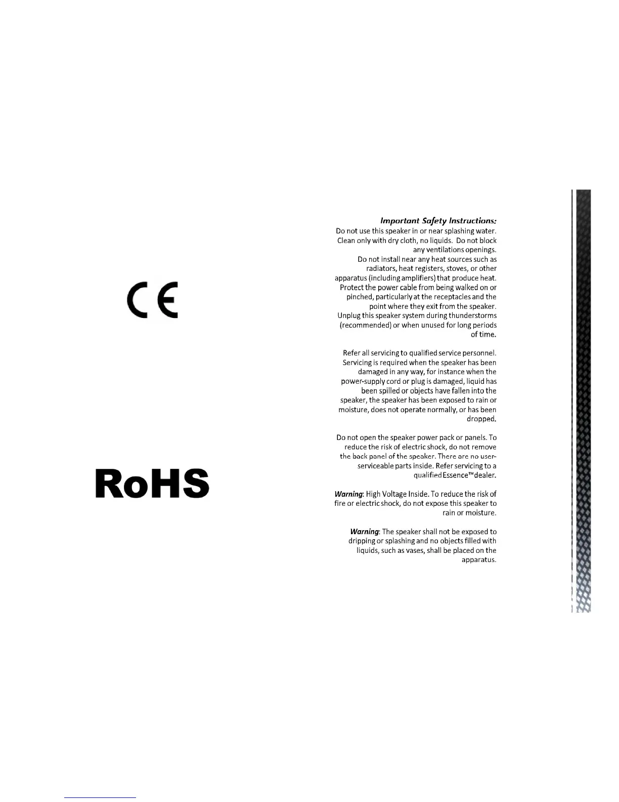 Essence 1200 - Important Safety Instructions; General Safety Precautions; High Voltage Warning; Liquid Exposure Warning
