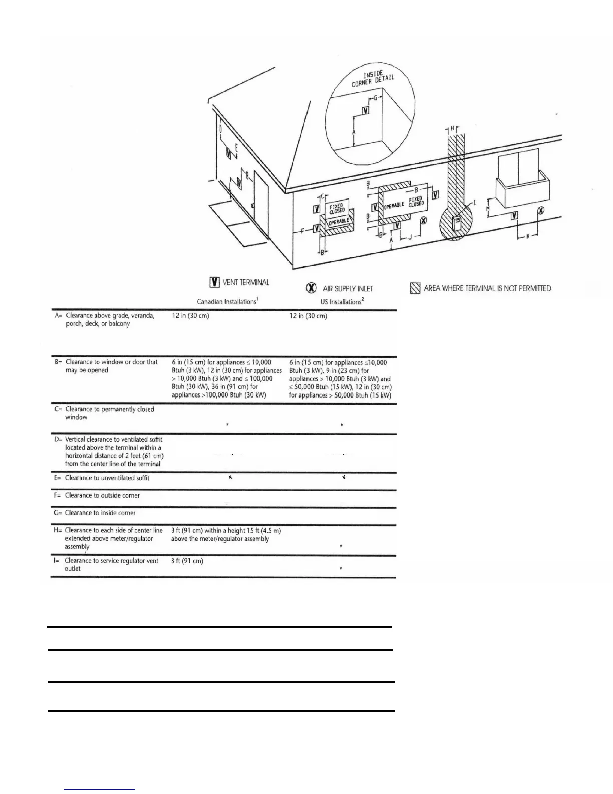 air supply inlet to building or Btuh (3kW), 12 in (30 cm) for Btuh (3kW), 9 in (23 cm) for