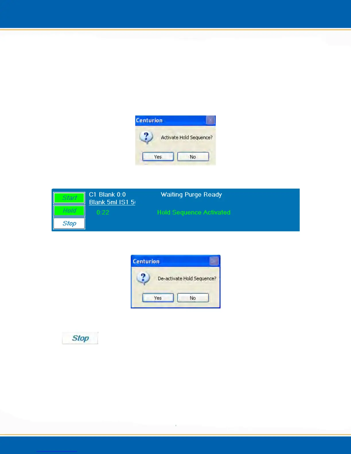 To resume the sequence <click> the Hold button and a popup will appear as shown in