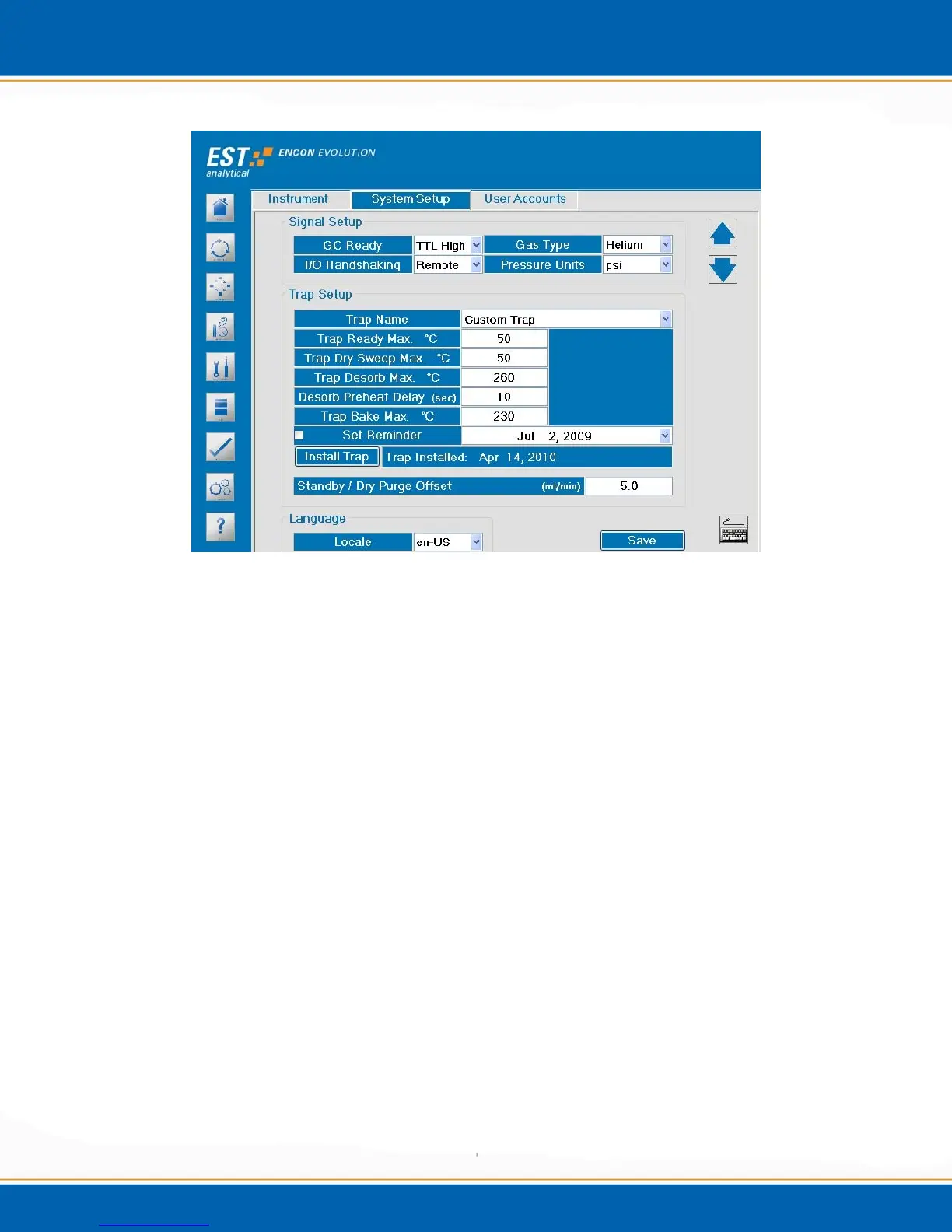 trap, GC ready signal, pressure units, maximum temperatures and to set the trap