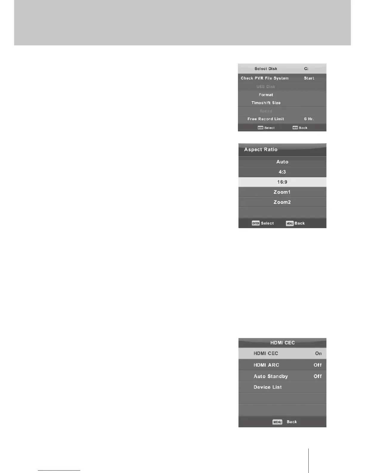 Aspect. (l’opzioni disponibili: Auto, 4:3, 16:9, Zoom 1, Zoom 2).