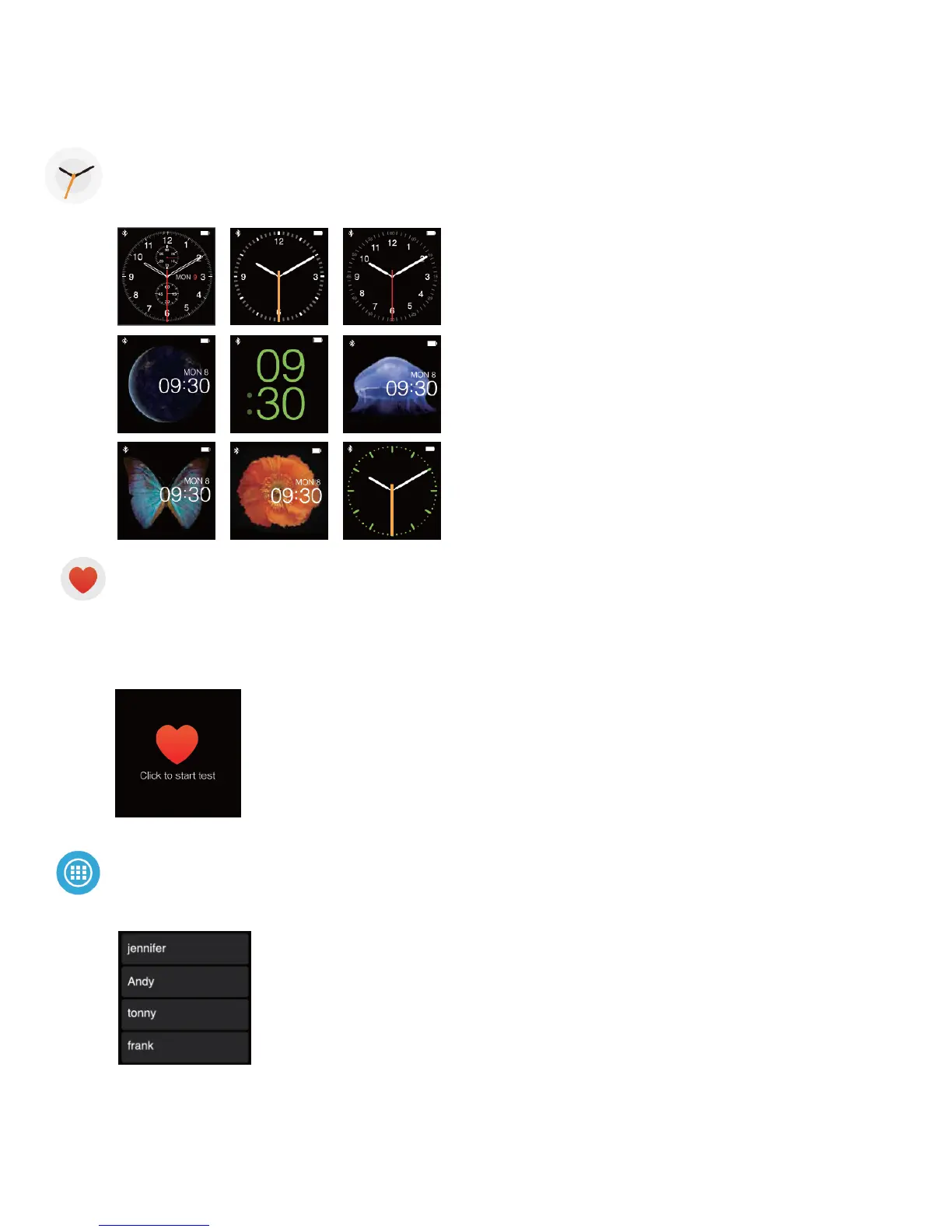 There are 9 watch faces in „eSTAR Smart Watch“ at your choice. Long press the screen for 3