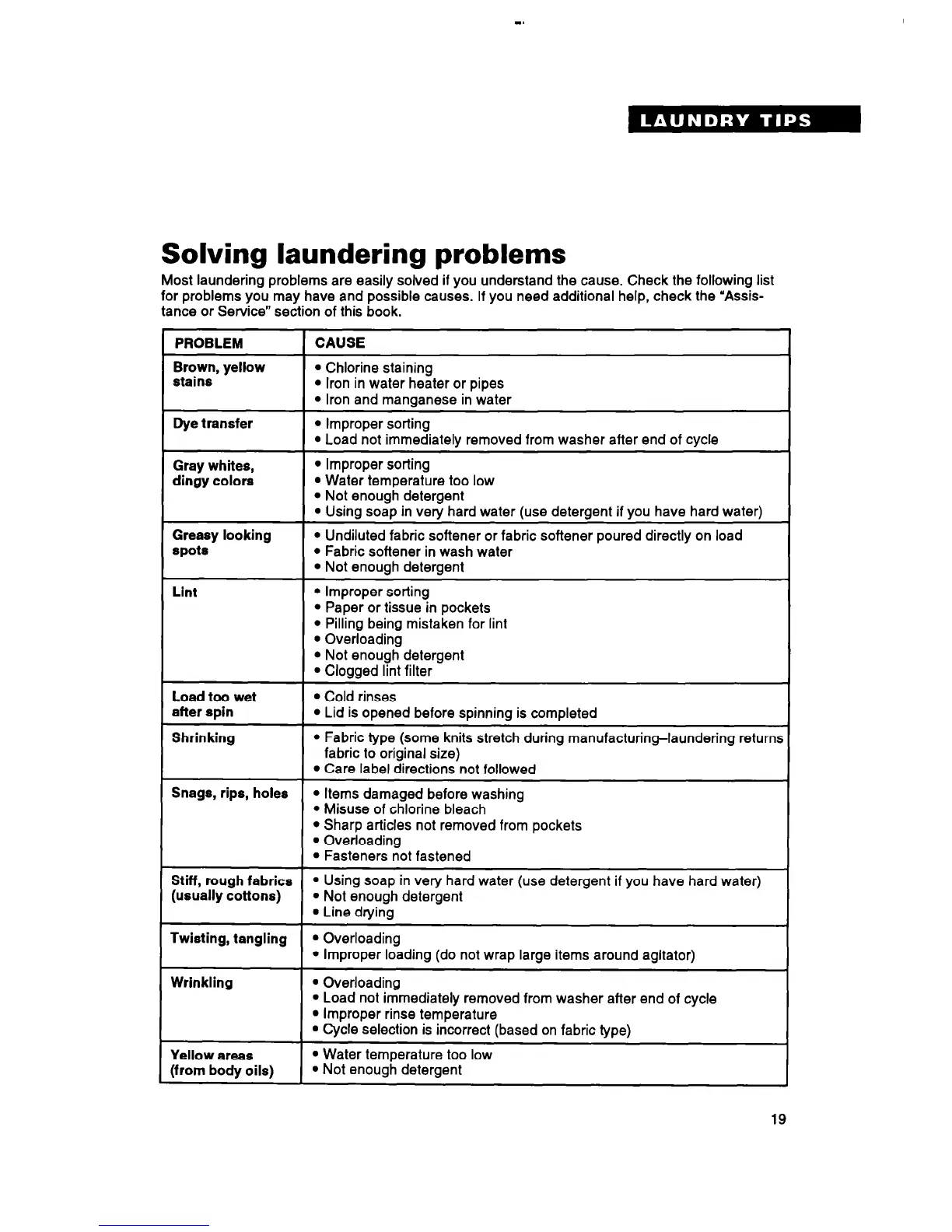 Most laundering problems are easily solved if you understand the cause. Check the following list
