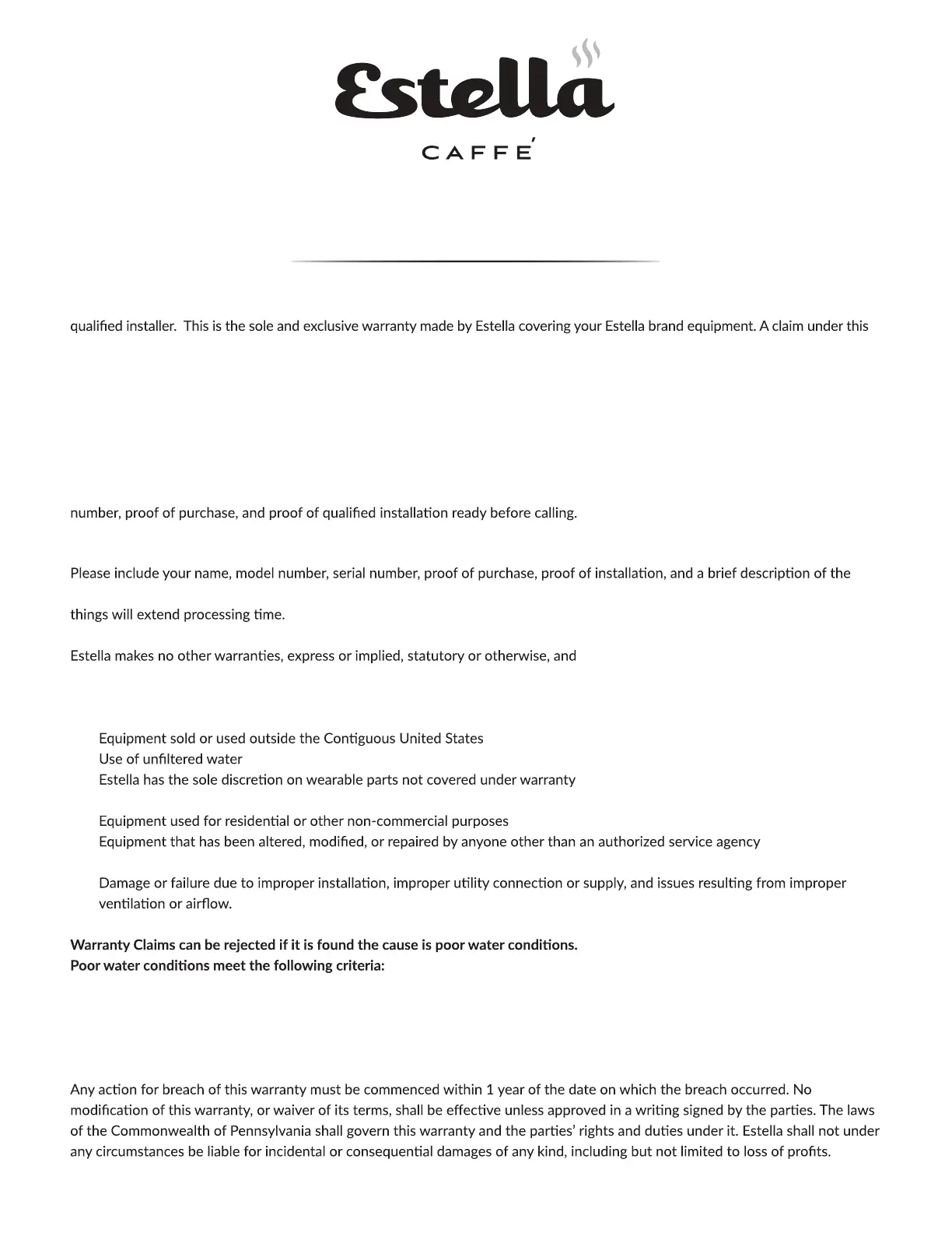 Estella warrants its equipment to be free from defects in material and workmanship for a period of 1 year when installed by a