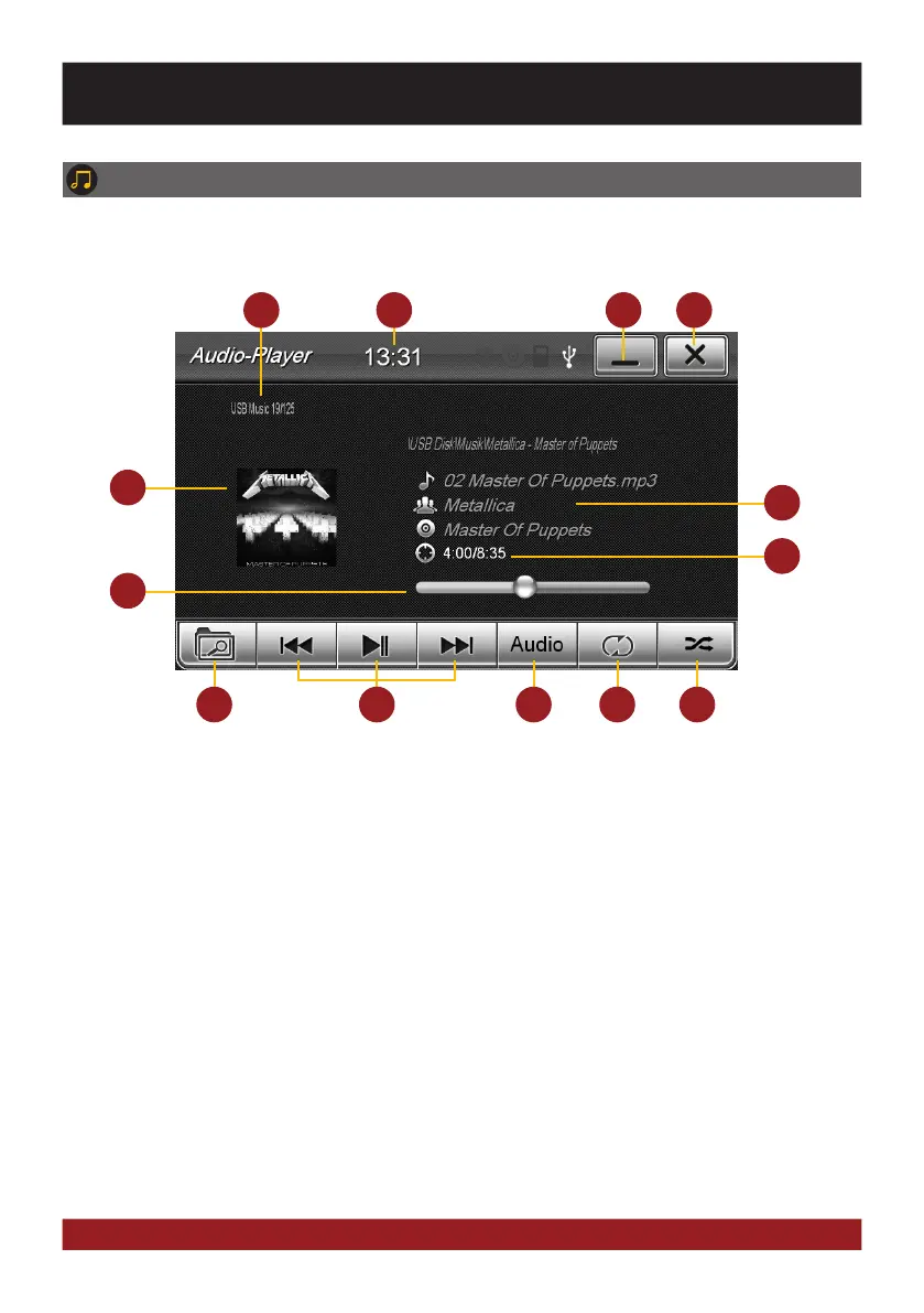 Open the audio player by tapping „Music“ in the main menu or by pressing the „MUSIC“ button on