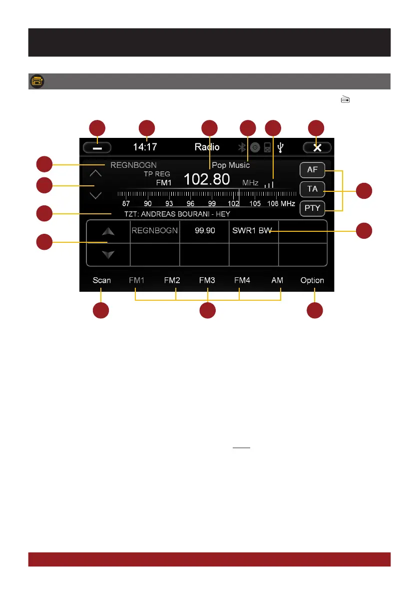Open the radio application by tapping on „Radio“ in the main menu or by pressing the „ “ button on