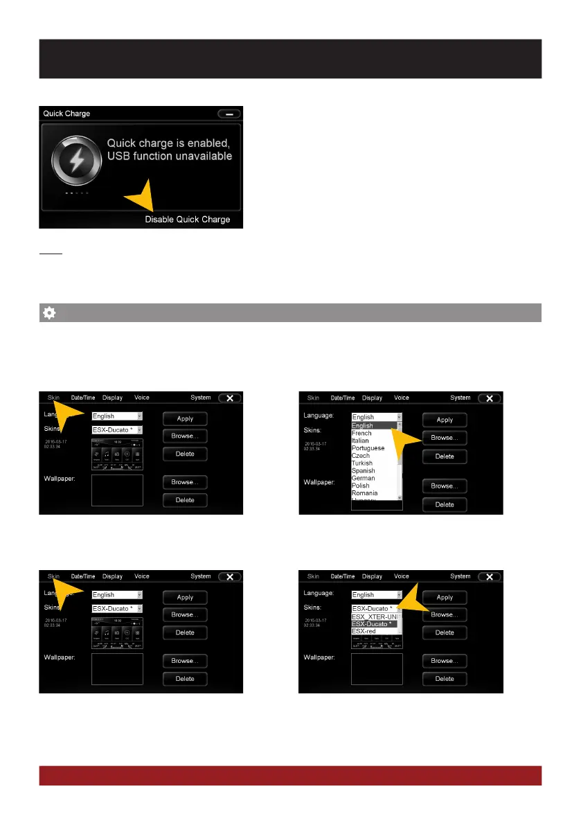 Tap on „Skin“. Select the desired language. Tap on „Apply“.