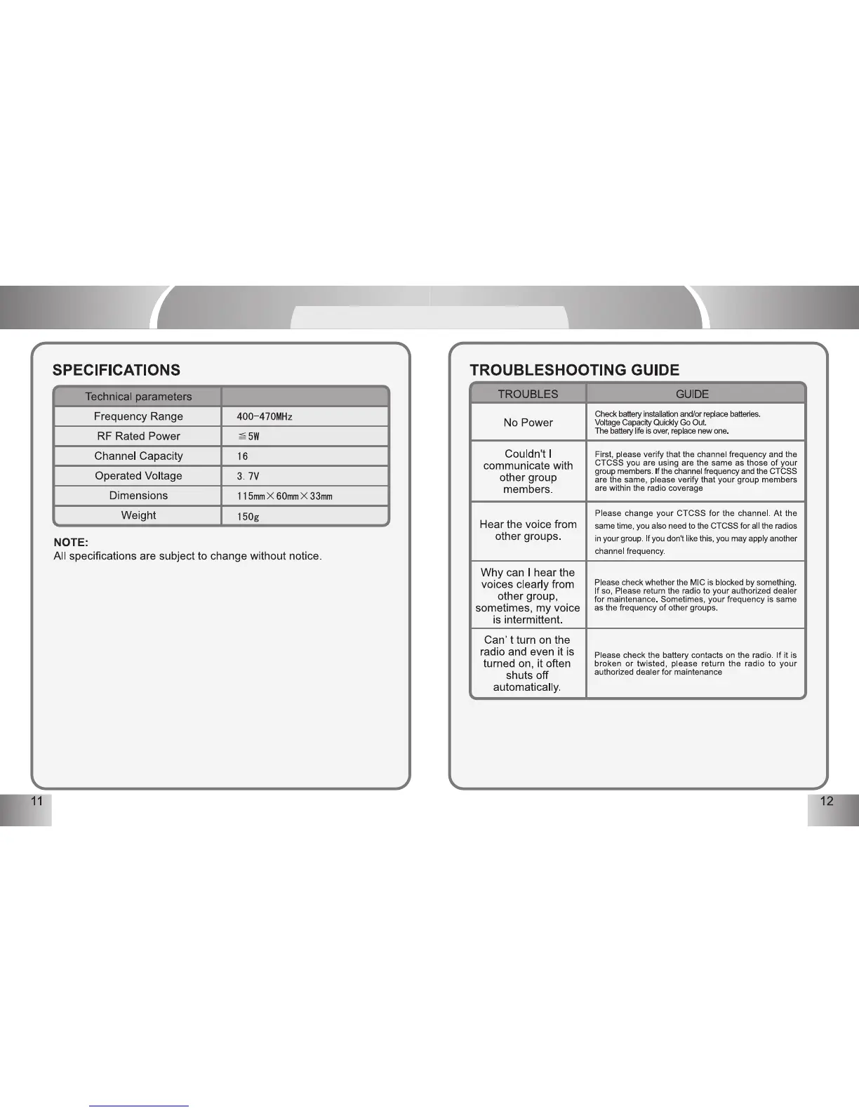eSYNiC CTCSS/DCS - SPECIFICATIONS; TROUBLESHOOTING GUIDE