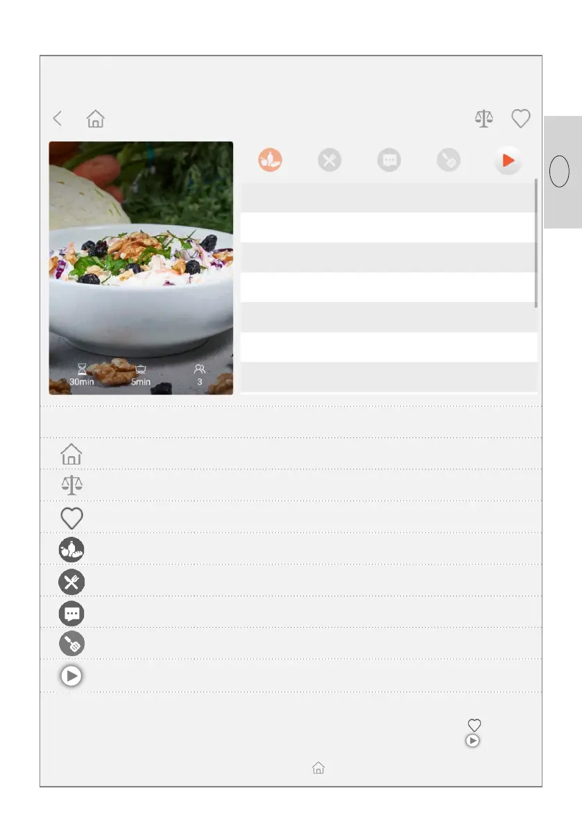 V menu receptov si môžete pod jednotlivými ikonami prejsť zoznam ingrediencií, kroky postupu