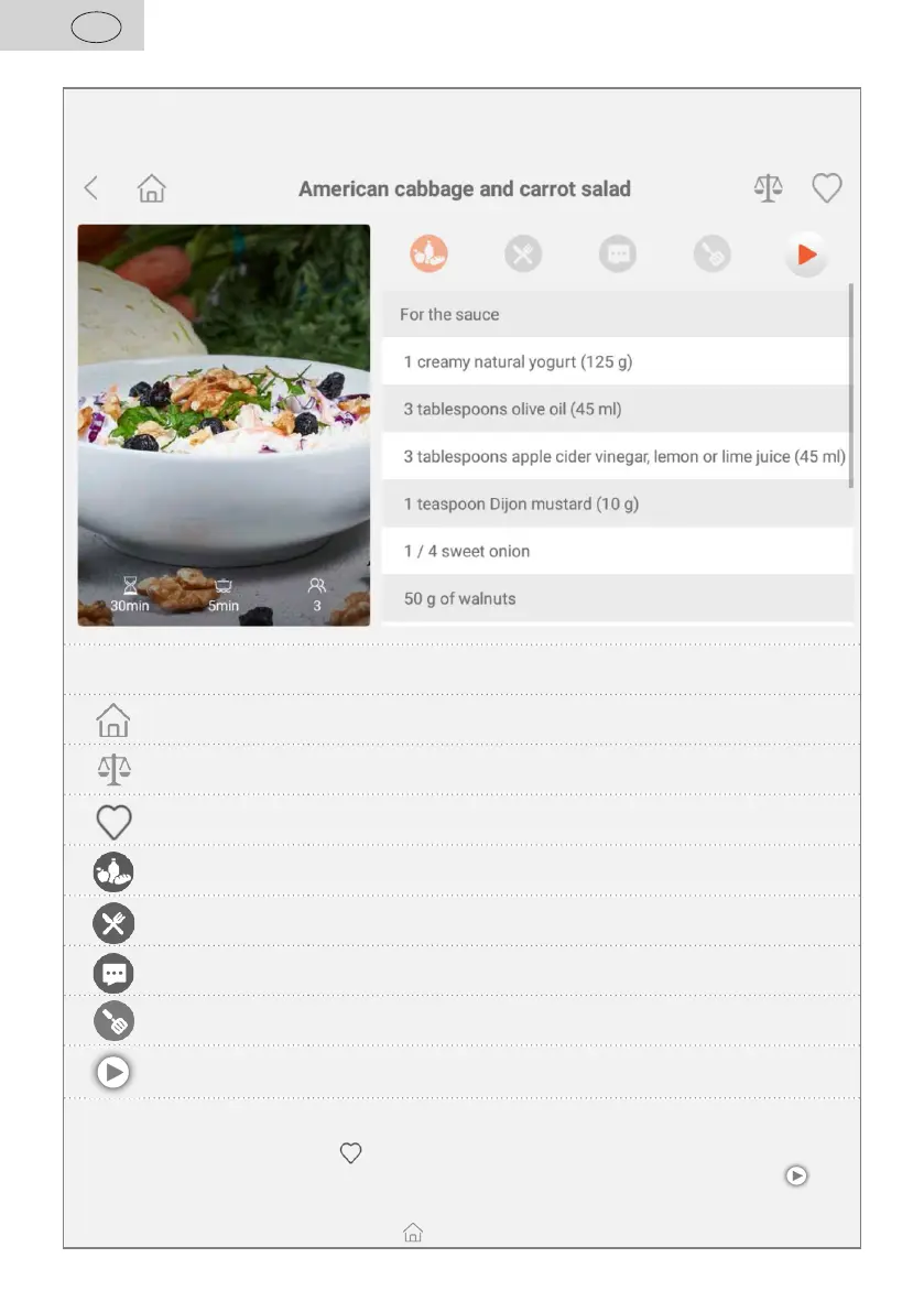 Im Menu Rezept können Sie sich unter einzelnen Symbolen die Liste von Zutaten,