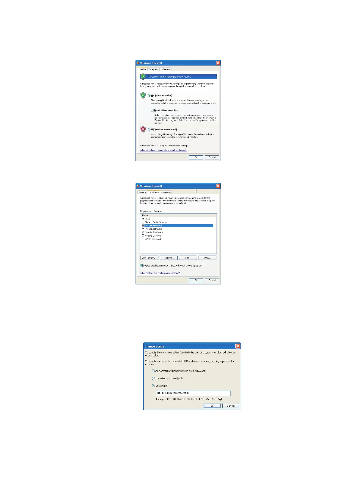 This tab lists the exceptions not blocked by the firewall. Use