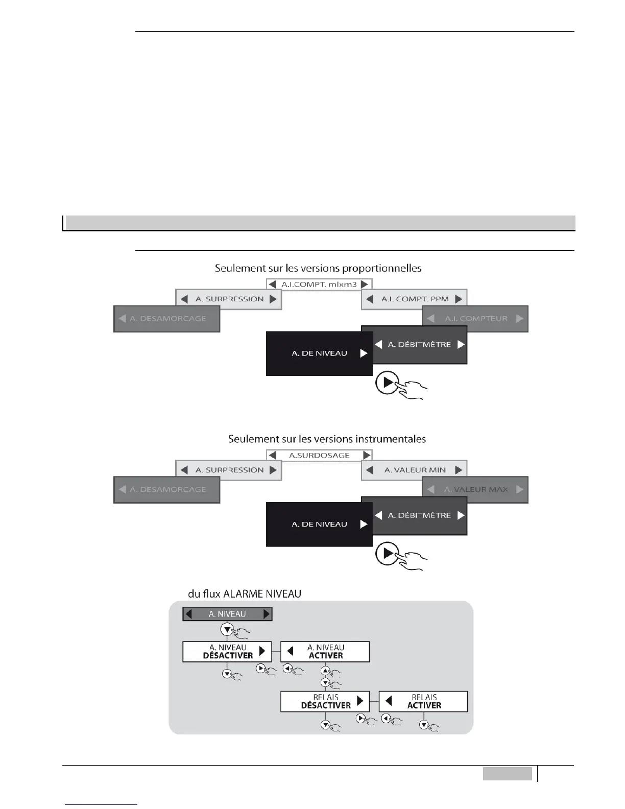 Par défaut les alarmes citées ci-dessus sont toutes désactivées sauf l’ALARME NIVEAU (par défaut ACTIVÉE)