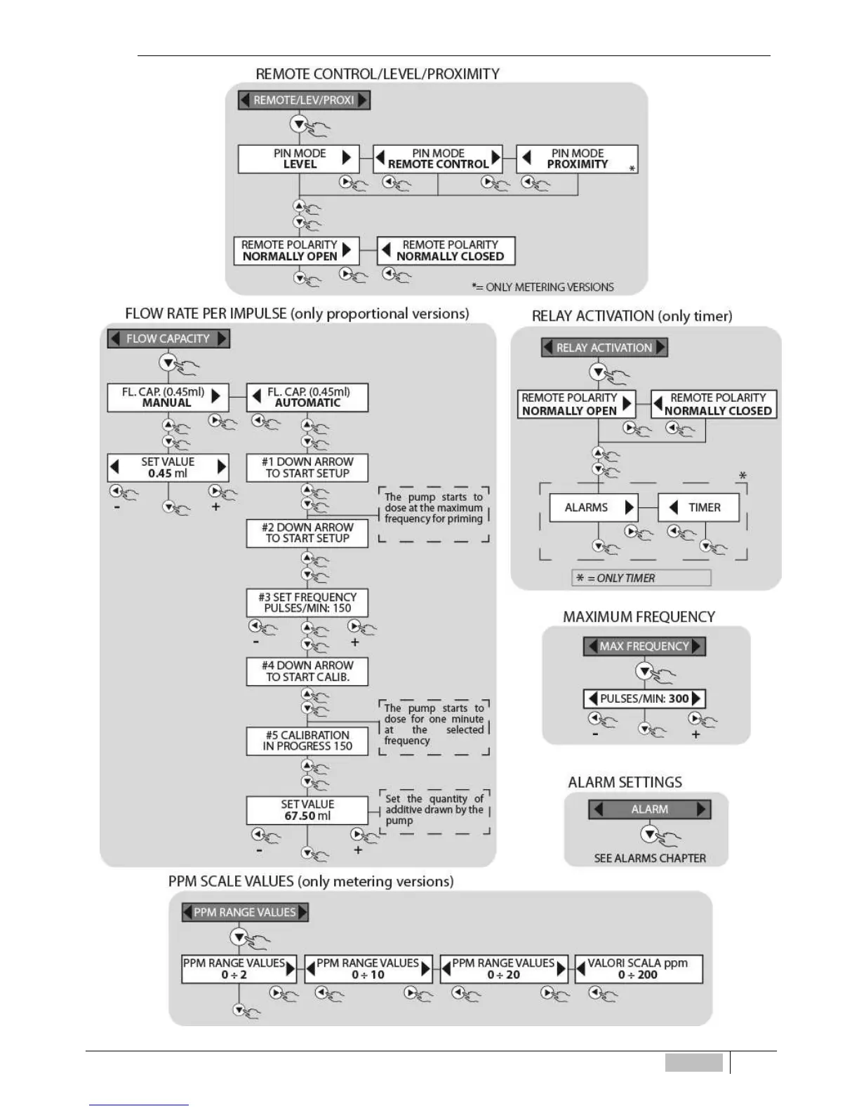 Flow diagram Remote Control/Level/Proximity, Relay Action, Flow Rate per Impulse, Scale