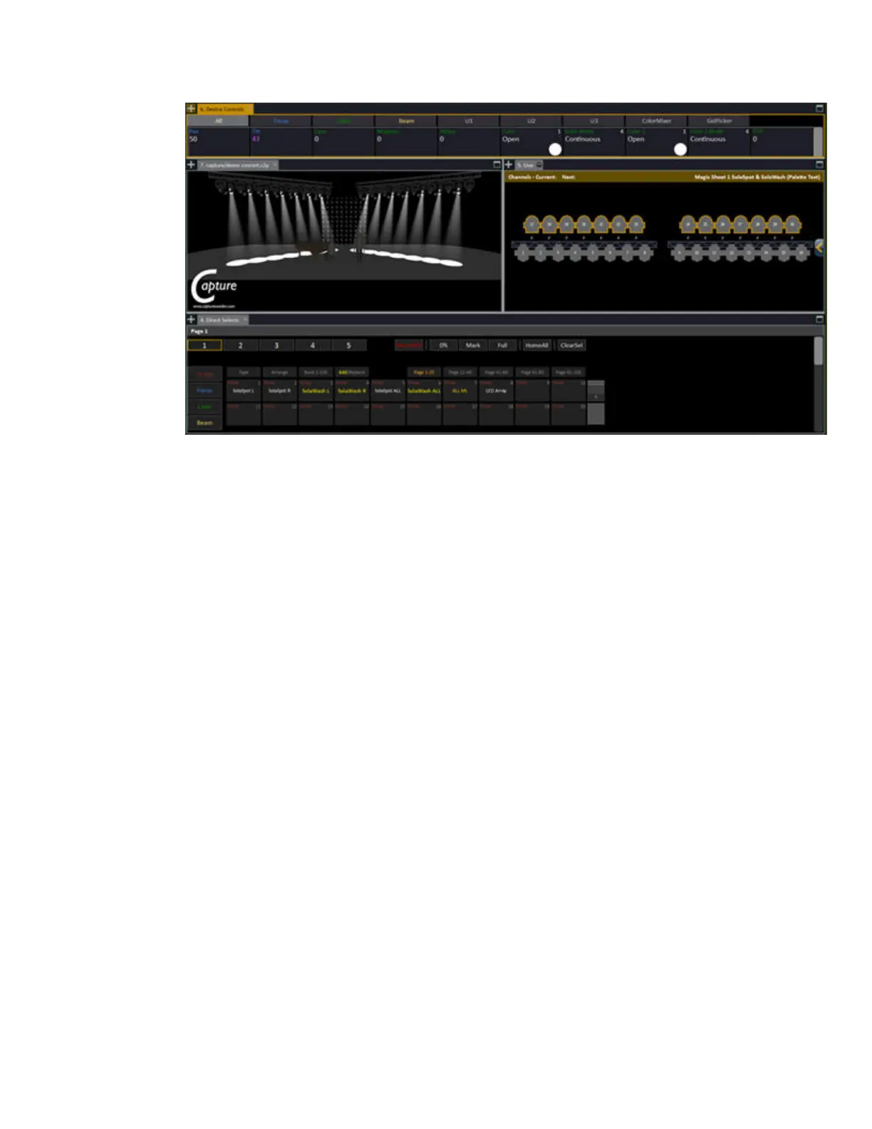 Demo Concert has a bigger lighting rig that is ideal for learning about effects. It contains both spot