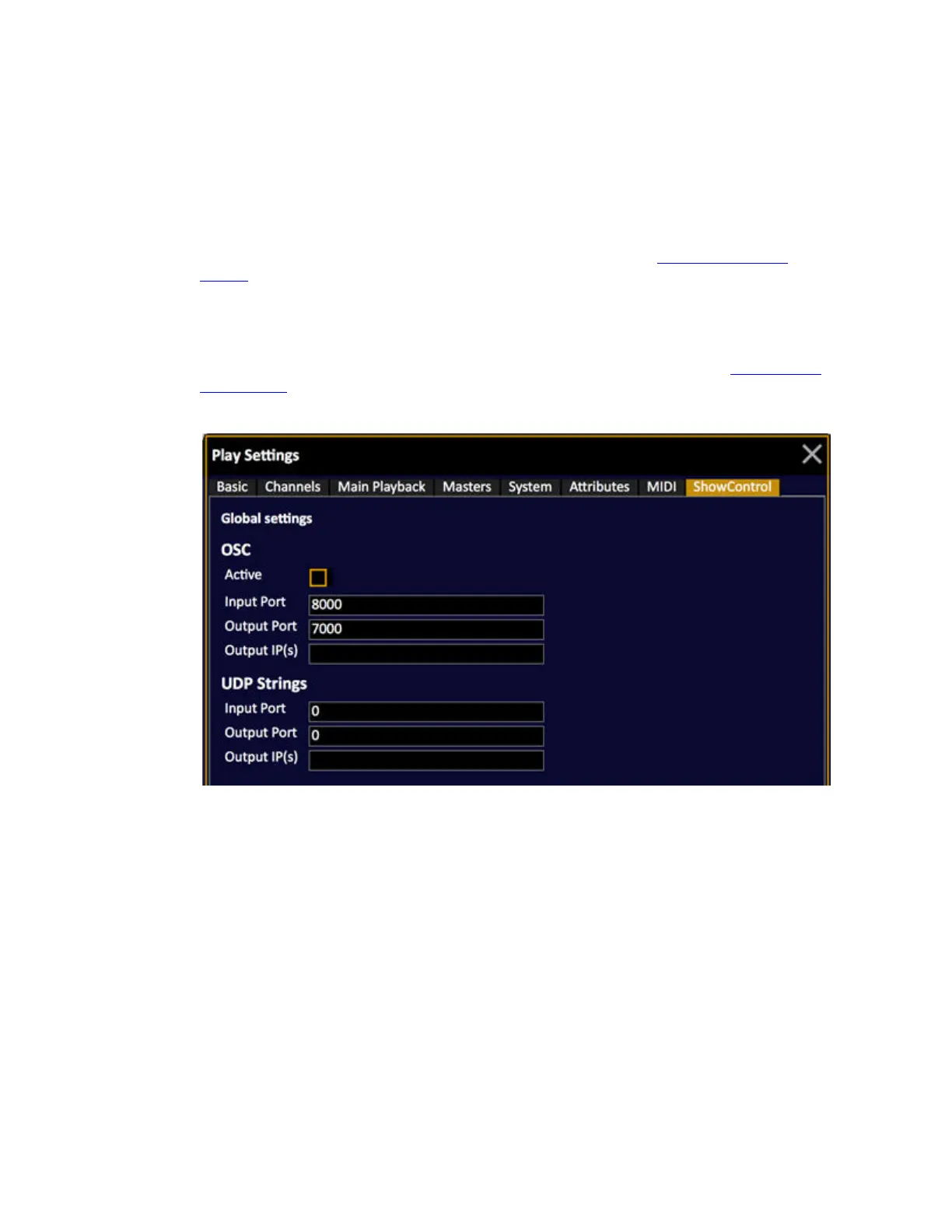 Show Control (Browser >General Settings >Play Settings) and the the text string you send needs to be